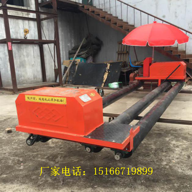 ①将机器运至施工现场,两行走辊平放于模板上(也可先接通电源,启动行走电机。使机器沿事先搭好的斜坡行驶至模板上)