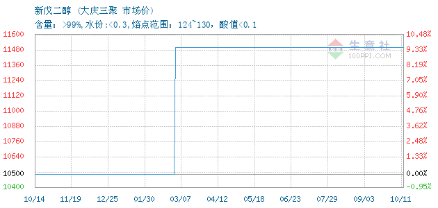 核心提示:05月05日大庆三聚关于新戊二醇的报价为10300元/吨。新戊二醇的规格:含量:......