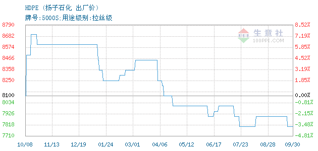 09月06日中国石化扬子石油化工有限公司关于HDPE的报价为9100元/吨。HDPE的规格:牌号:5000S;用途级别:拉丝级。该报价有效期为3天。报价提供方:中国石化扬子石油化工有限公司。