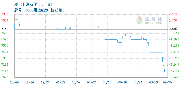 09月15日上海石化关于PP的报价为8000元/吨。PP的规格:牌号:T30S;用途级别:拉丝级;。该报价有效期为3天。报价提供方:中国石化上海石油化工股份有限公司。
