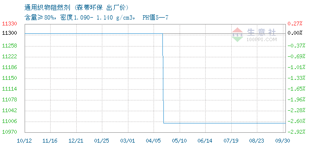 核心提示:09月19日河南森蒂环保科技有限公司关于通用织物阻燃剂的报价为11300元/吨。......