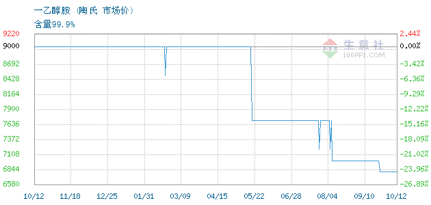 12月12日陶氏关于一乙醇胺的报价为9000元/吨。一乙醇胺的规格:含量99.9%。该报价有效期为3天。报价提供方:广州市天悦化工有限公司。