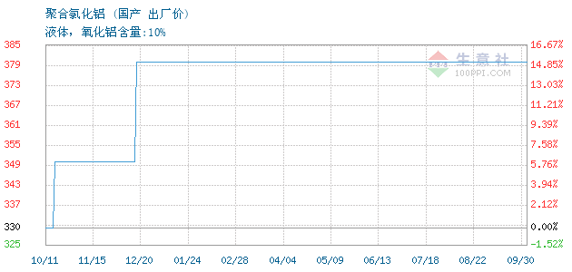 核心提示:01月24日国产关于聚合氯化铝的报价为330元/吨。聚合氯化铝的规格:液体,氧化......