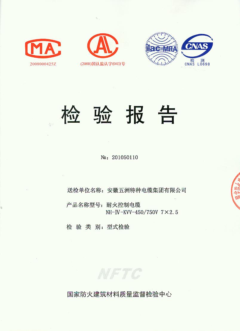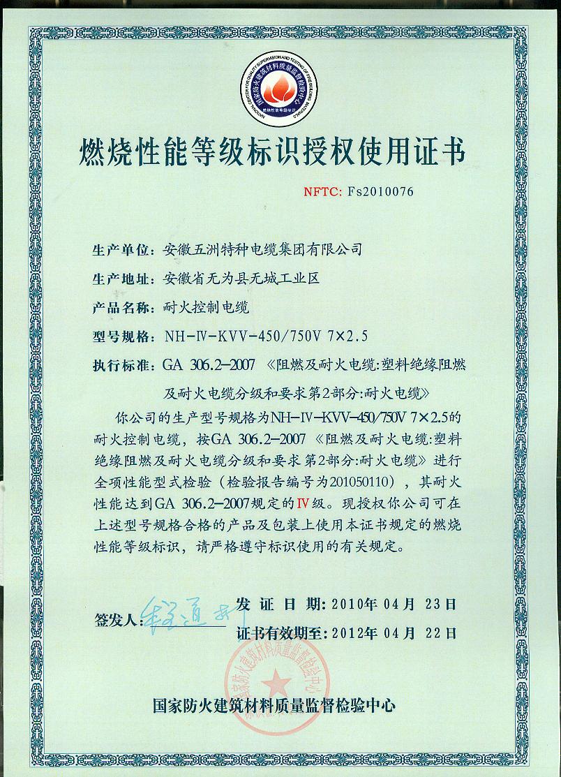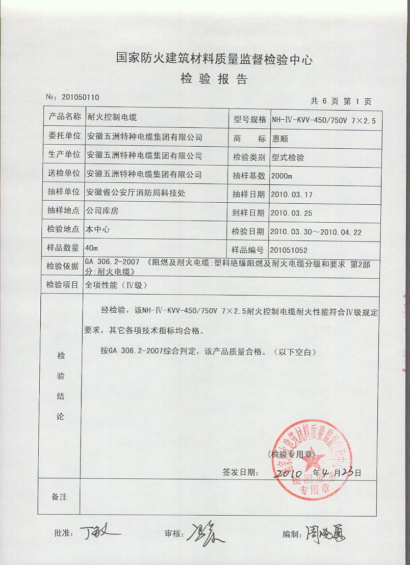 经检验,该NH-Ⅳ-KVV-450/750V 7×2.5耐火控制电缆耐火性能符合Ⅳ级规定要 求,其它各项技术指标均合格。 按GA 306.2-2007综合判定,该产品质量合格。 (以下空白)