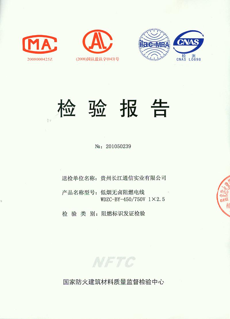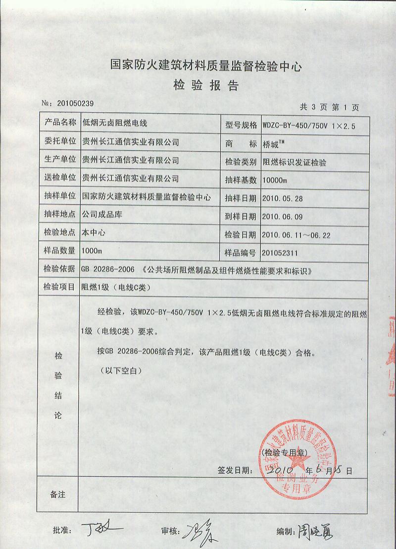经检验,该WDZC-BY-450/750V 1×2.5低烟无卤阻燃电线符合标准规定的阻燃1级(电线C类)要求。 按GB 20286-2006综合判定,该产品阻燃1级(电线C类)合格。(以下空白)