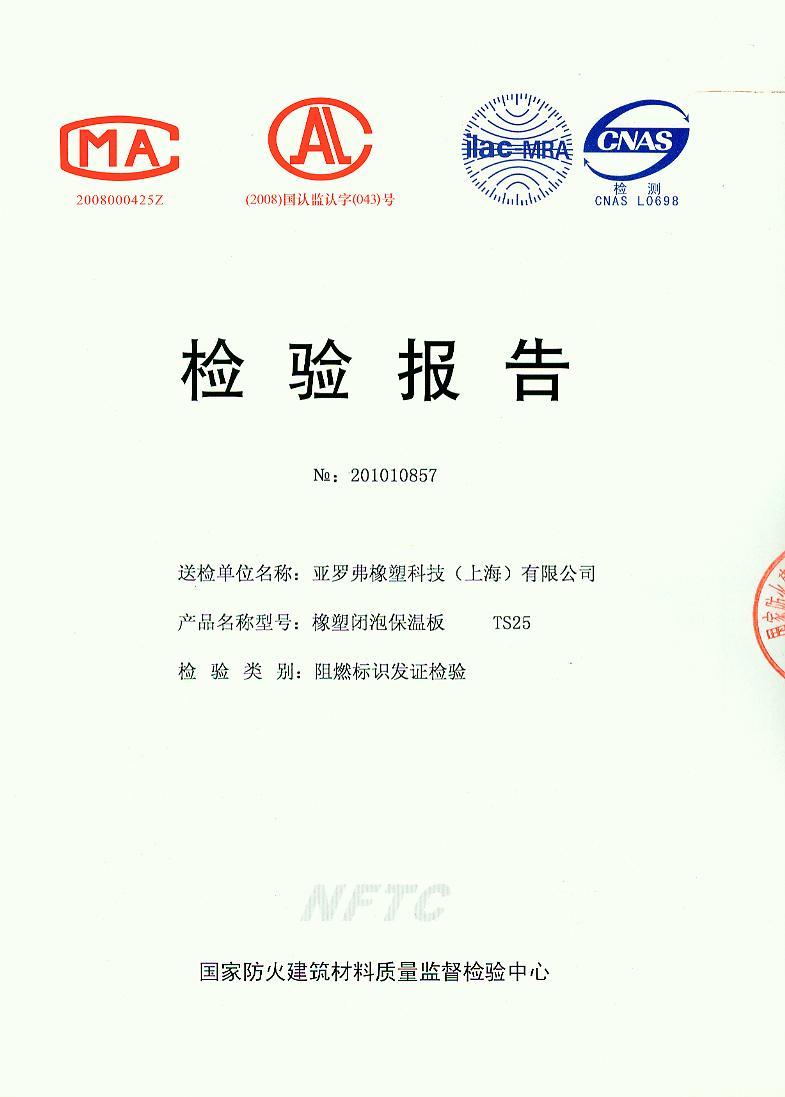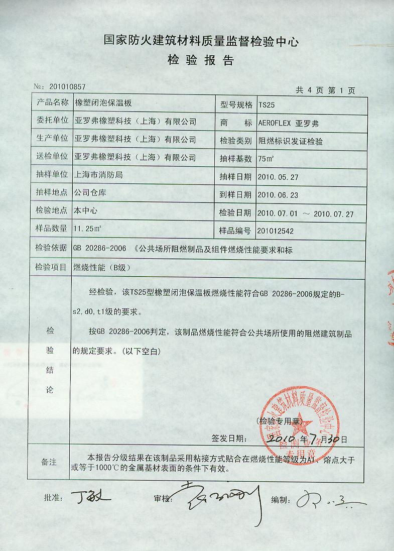 经检验,该TS25型橡塑闭泡保温板燃烧性能符合GB 20286-2006规定的B-s2,d0,t1级的要求。 按GB 20286-2006判定,该制品燃烧性能符合公共场所使用的阻燃建筑制品的规定要求。(以下空白)
