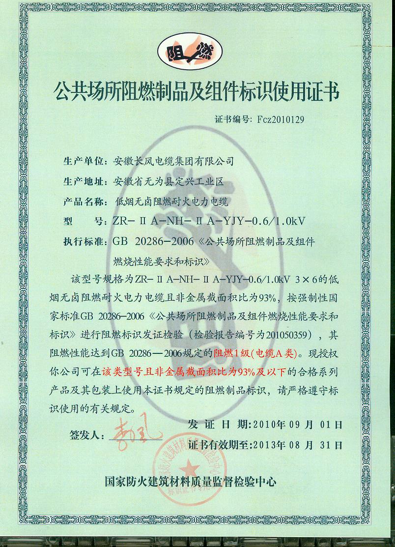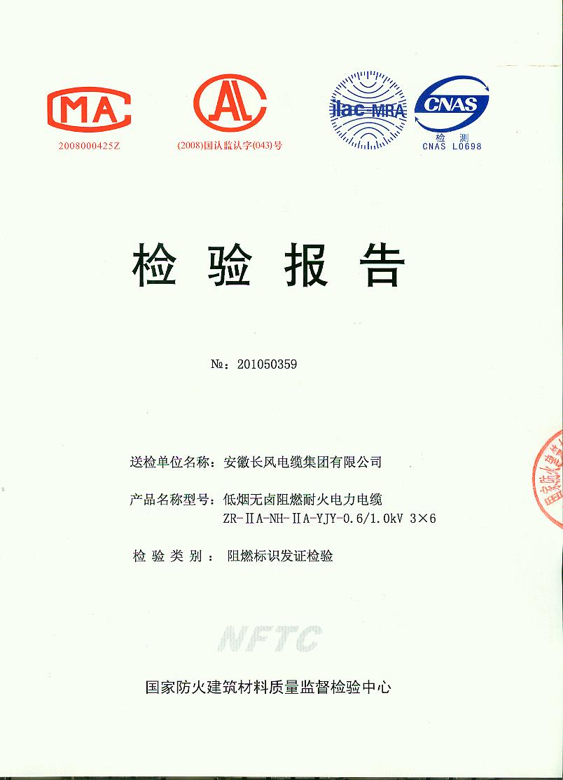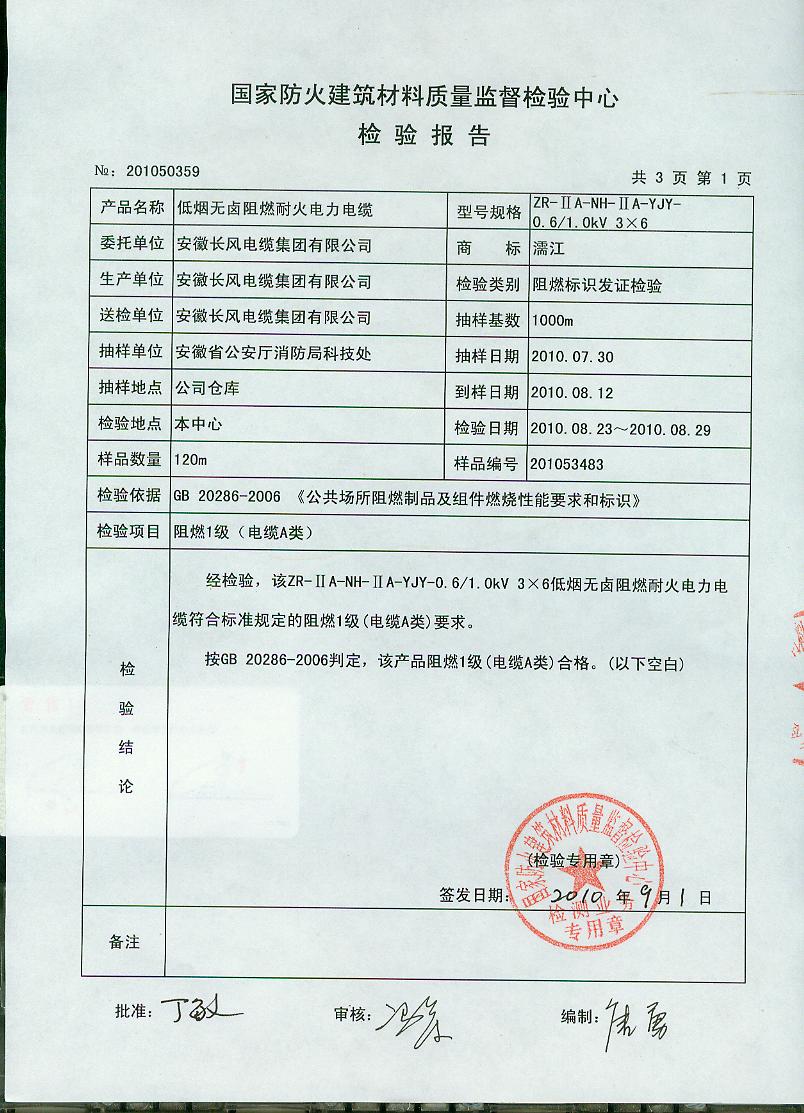 经检验,该ZR-ⅡA-NH-ⅡA-YJY-0.6/1.0kV 3×6低烟无卤阻燃耐火电力电缆符合标准规定的阻燃1级(电缆A类)要求。 按GB 20286-2006判定,该产品阻燃1级(电缆A类)合格。(以下空白)