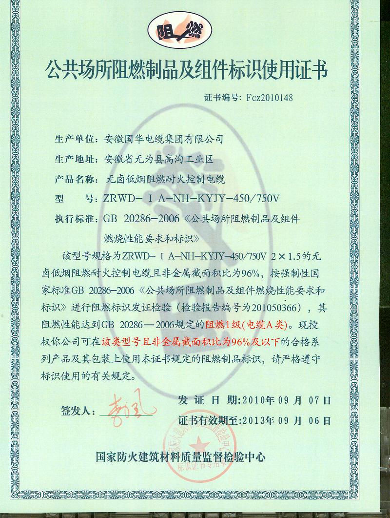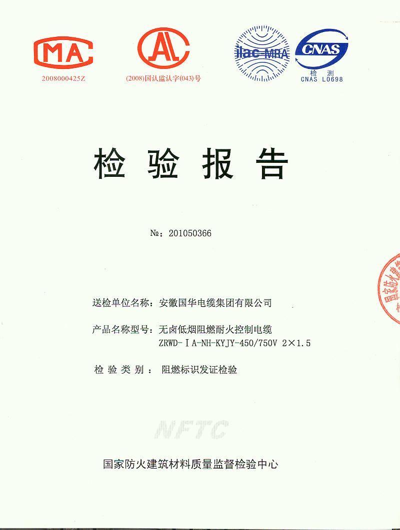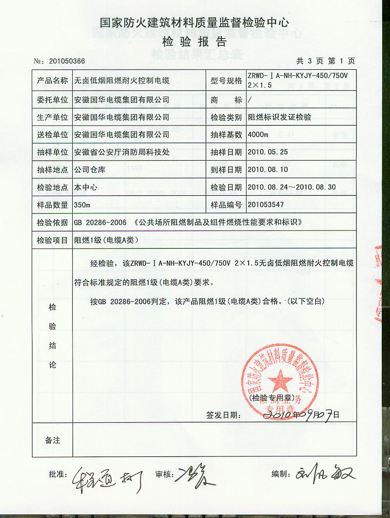 经检验,该ZRWD-ⅠA-NH-KYJY-450/750V 2×1.5无卤低烟阻燃耐火控制电缆符合标准规定的阻燃1级(电缆A类)要求。 按GB 20286-2006判定,该产品阻燃1级(电缆A类)合格。(以下空白)