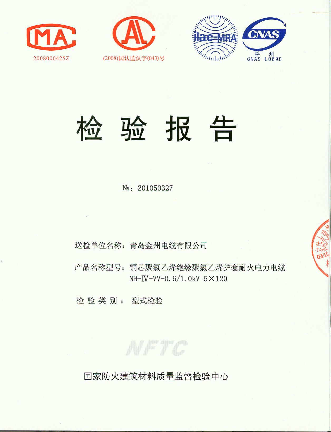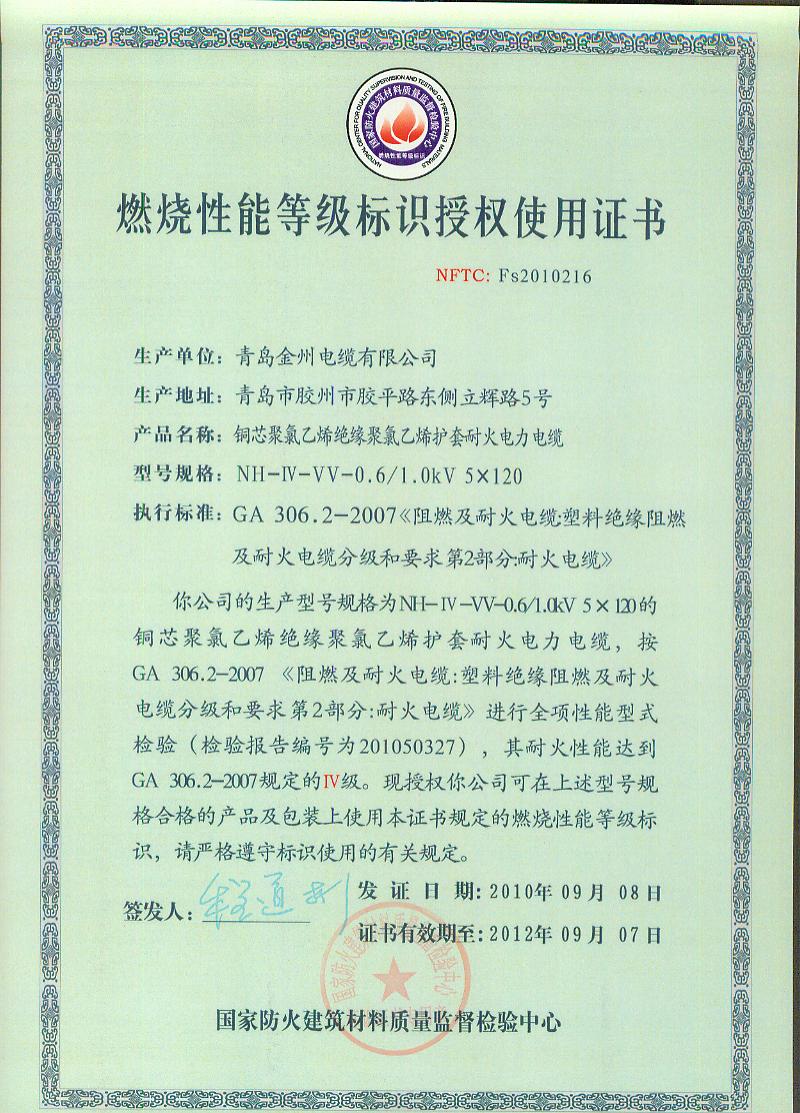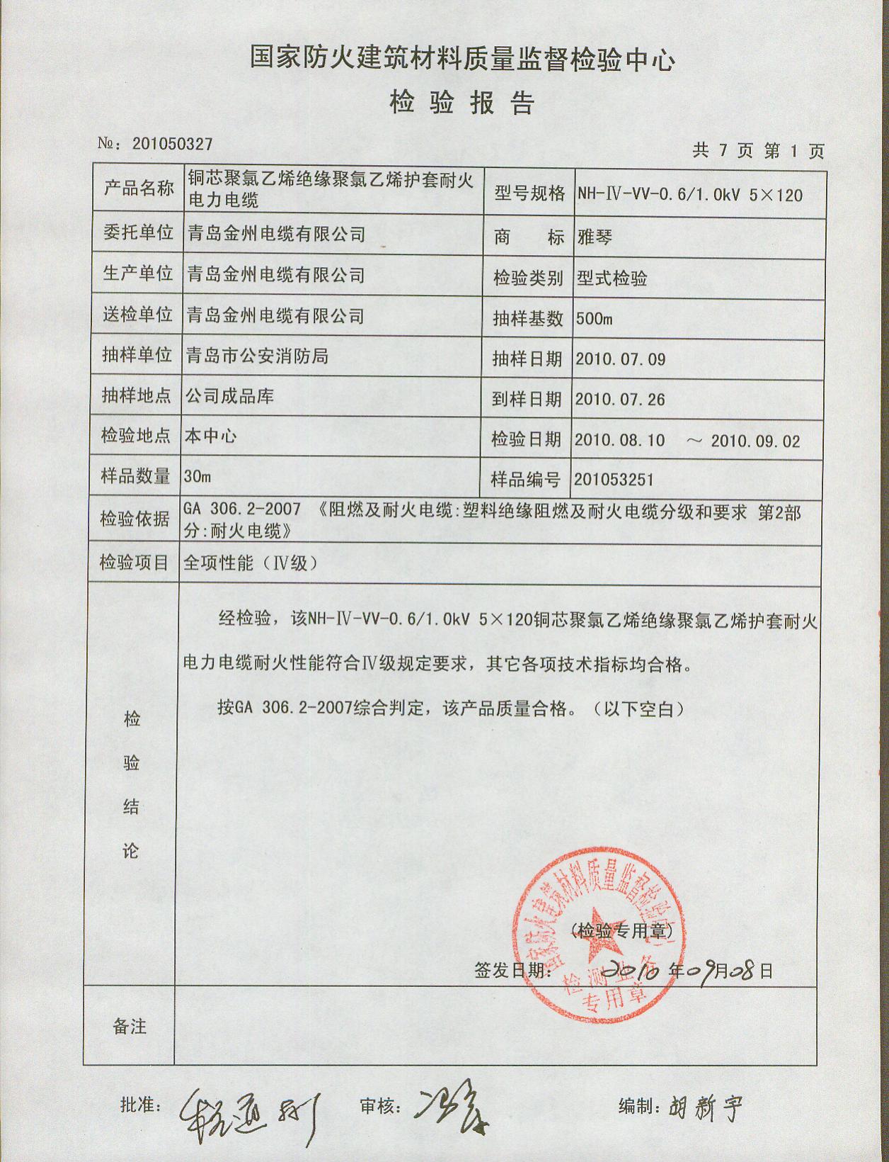 经检验,该NH-Ⅳ-VV-0.6/1.0kV 5×120铜芯聚氯乙烯绝缘聚氯乙烯护套耐火电力电缆耐火性能符合Ⅳ级规定要求,其它各项技术指标均合格。 按GA 306.2-2007综合判定,该产品质量合格。 (以下空白)