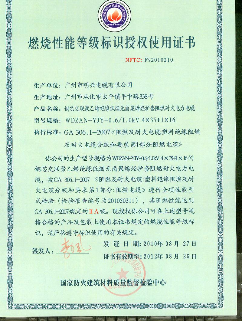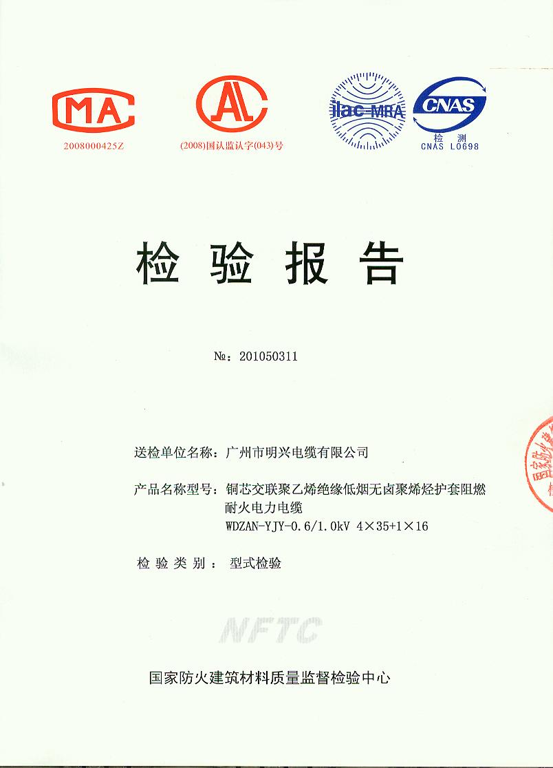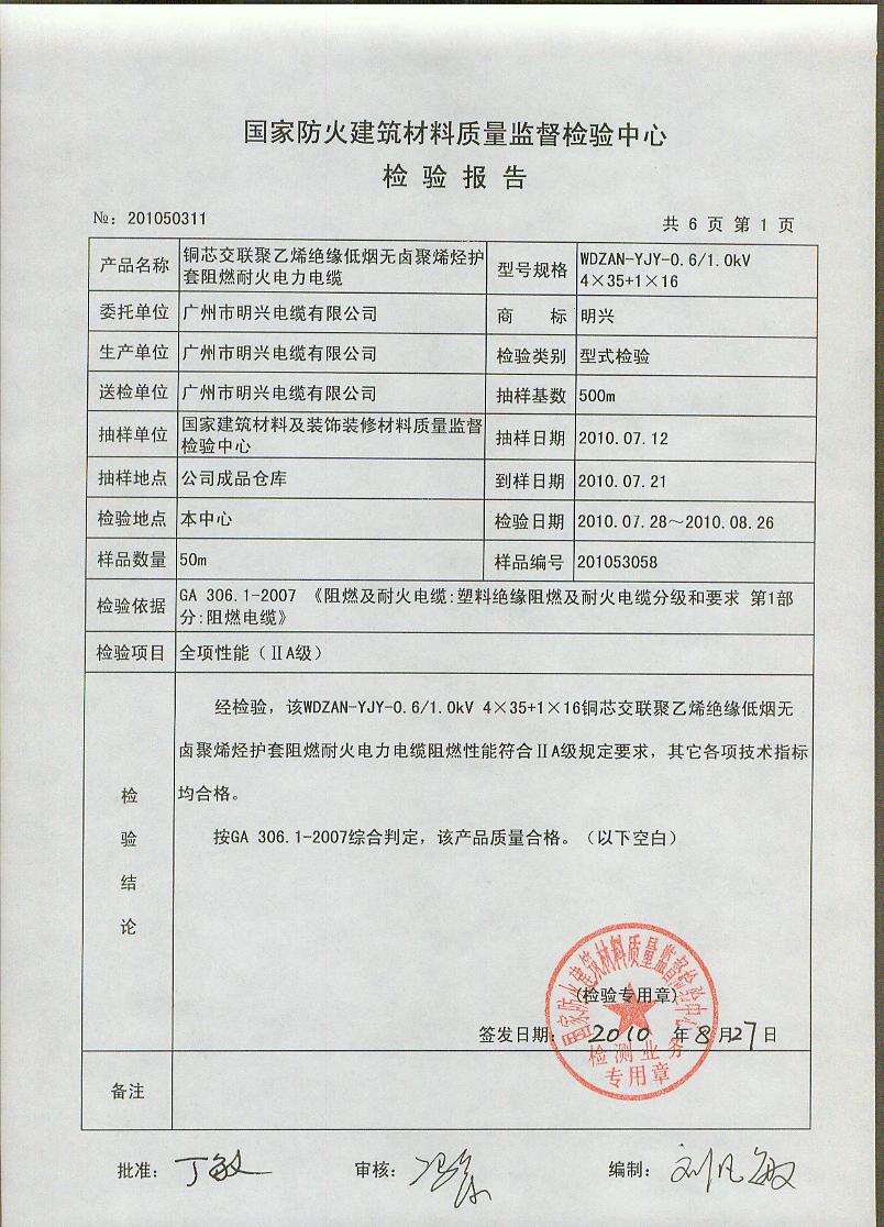 经检验,该WDZAN-YJY-0.6/1.0kV 4×35+1×16铜芯交联聚乙烯绝缘低烟无卤聚烯烃护套阻燃耐火电力电缆阻燃性能符合ⅠA级规定要求,其它各项技术指标均合格。按GA 306.1-2007综合判定,该产品质量合格。(以下空白)