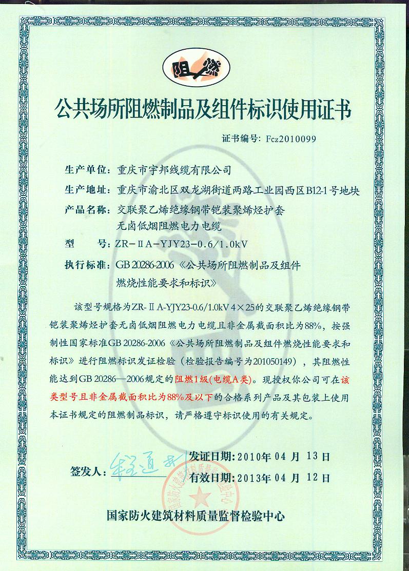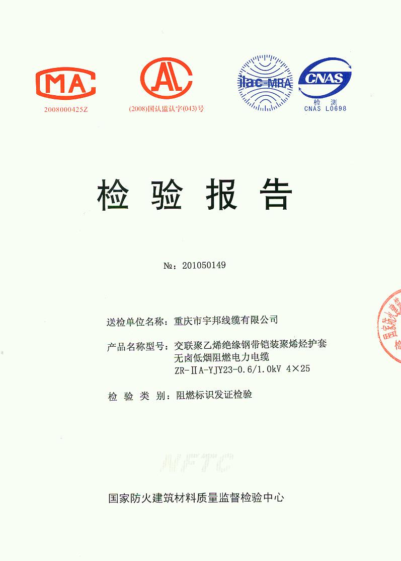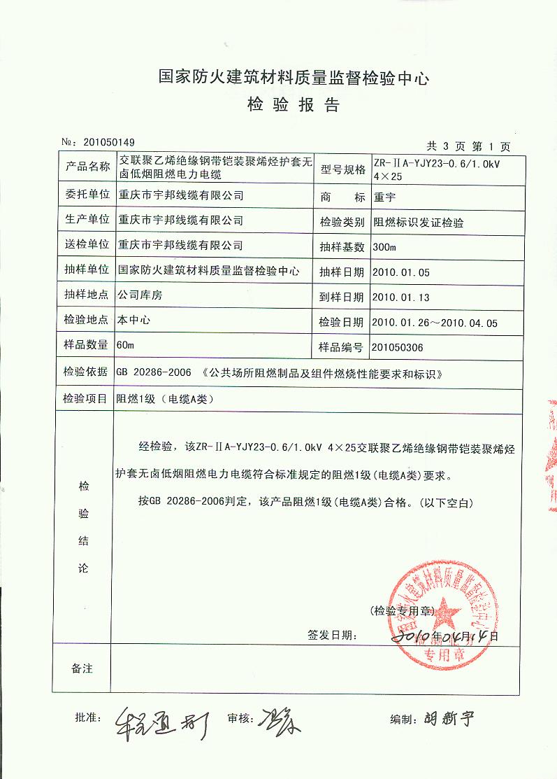 经检验,该ZR-ⅡA-YJY23-0.6/1.0kV 4×25交联聚乙烯绝缘钢带铠装聚烯烃护套无卤低烟阻燃电力电缆符合标准规定的阻燃1级(电缆A类)要求。 按GB 20286-2006判定,该产品阻燃1级(电缆A类)合格。(以下空白)