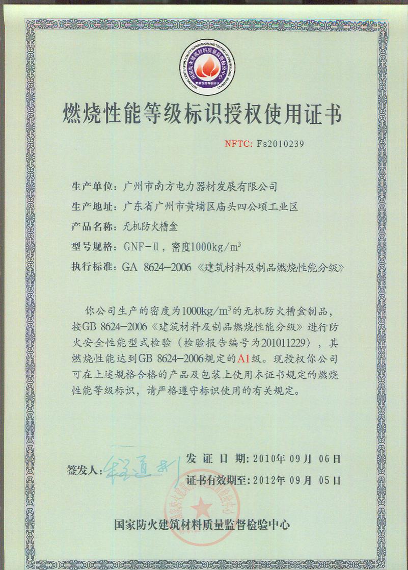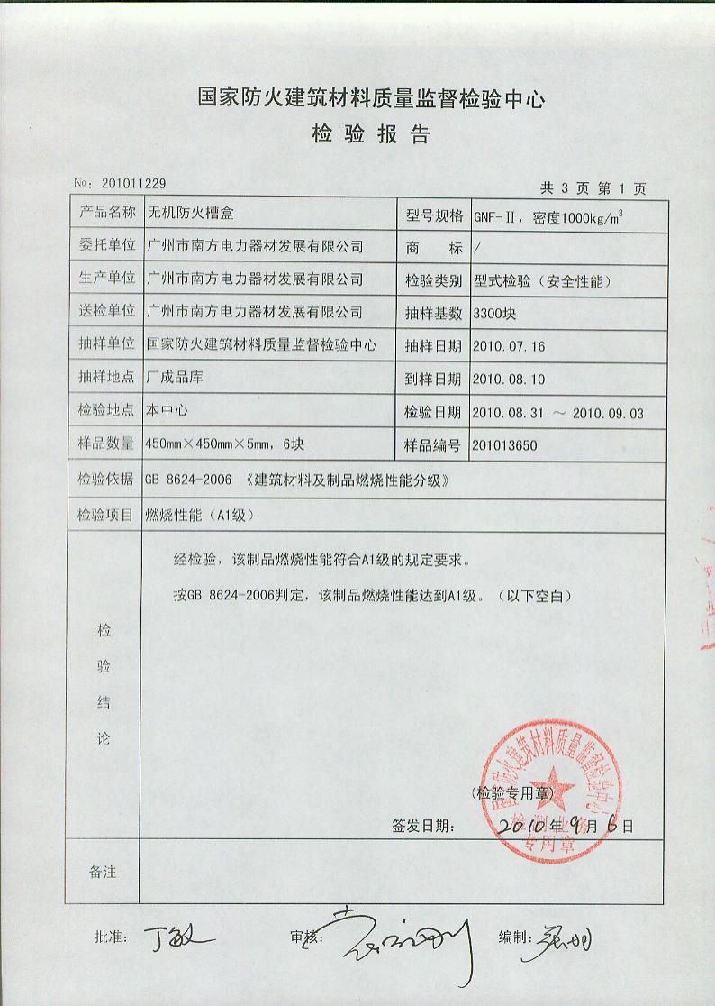 经检验,该制品燃烧性能符合A1级的规定要求。按GB 8624-2006判定,该制品燃烧性能达到A1级。(以下空白)
