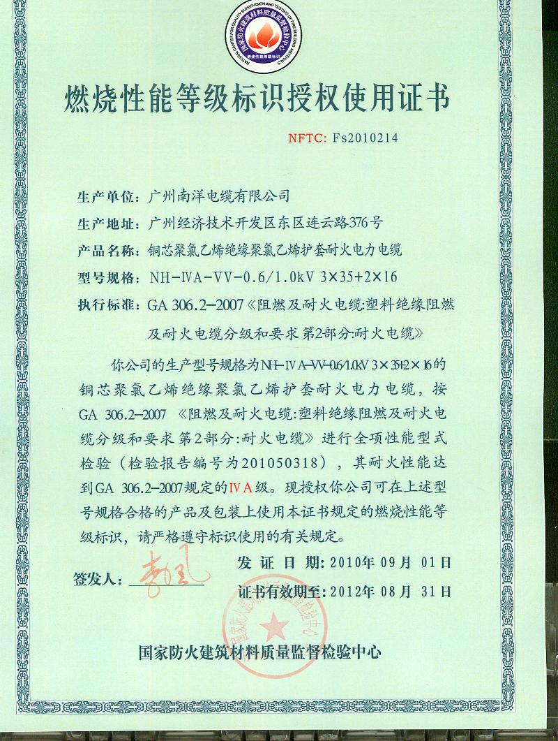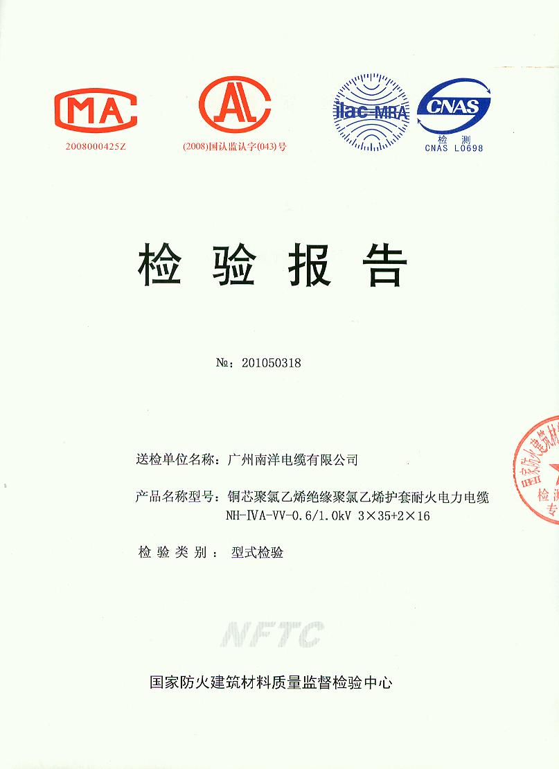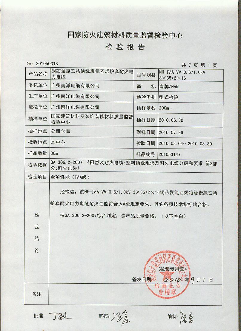 经检验,该NH-ⅣA-VV-0.6/1.0kV 3×35+2×16铜芯聚氯乙烯绝缘聚氯乙烯护套耐火电力电缆耐火性能符合ⅣA级规定要求,其它各项技术指标均合格。 按GA 306.2-2007综合判定,该产品质量合格。 (以下空白)