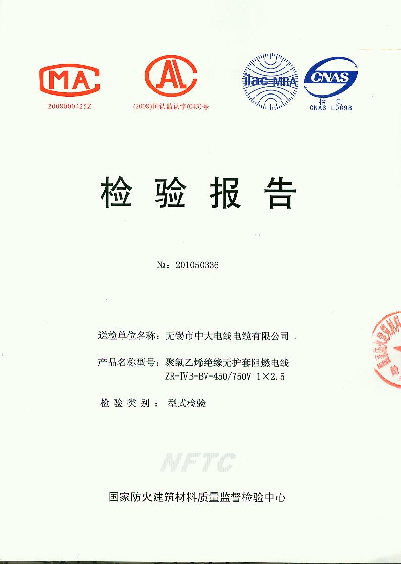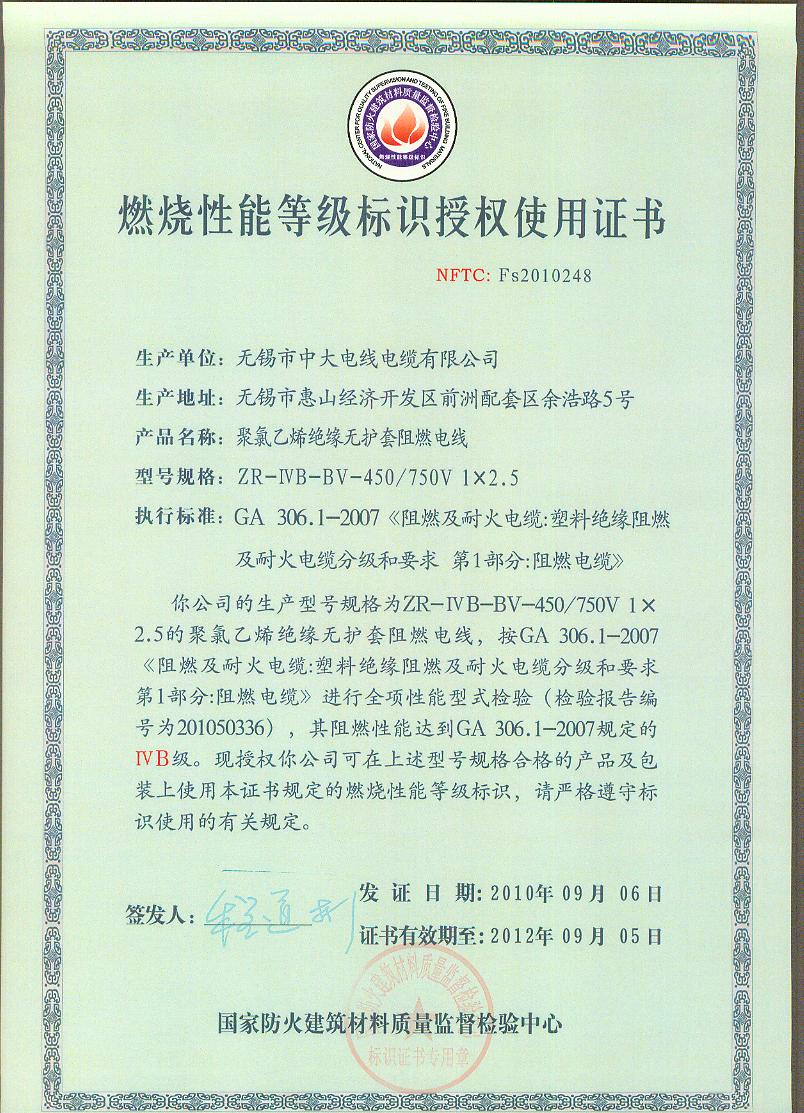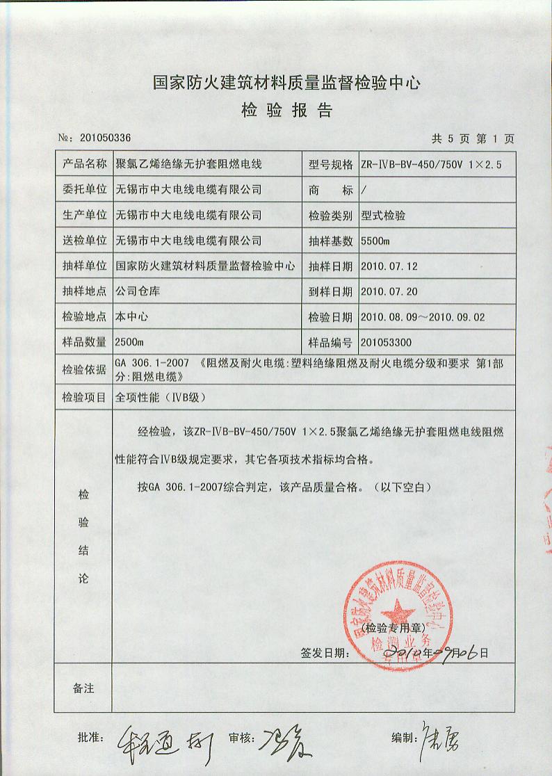 经检验,该ZR-ⅣB-BV-450/750V 1×2.5聚氯乙烯绝缘无护套阻燃电线耐火性能符合Ⅳ级规定要求,其它各项技术指标均合格。 按GA 306.2-2007综合判定,该产品质量合格。 (以下空白)