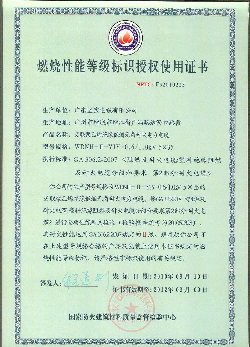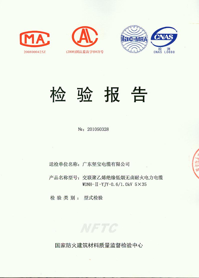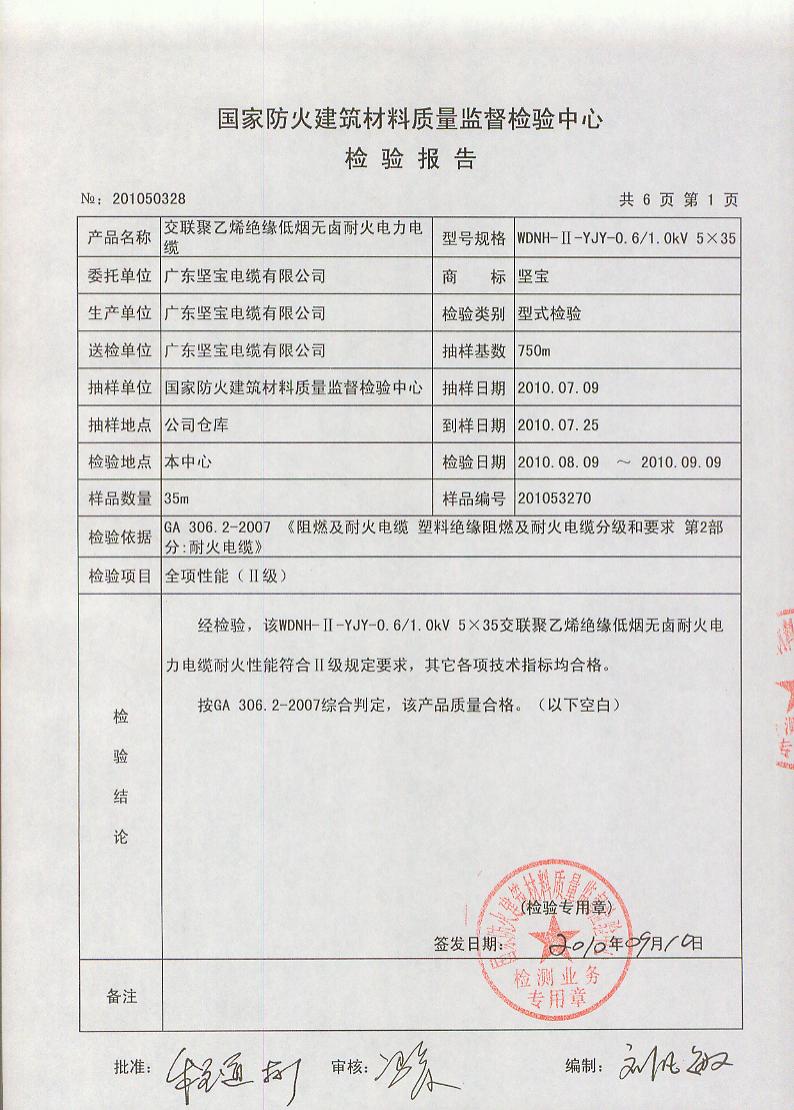 经检验,该WDNH-ⅡB-YJY-0.6/1.0kV 5×35交联聚乙烯绝缘低烟无卤耐火电力电缆耐火性能符合Ⅱ级规定要求,其它各项技术指标均合格。 按GA 306.2-2007综合判定,该产品质量合格。(以下空白)