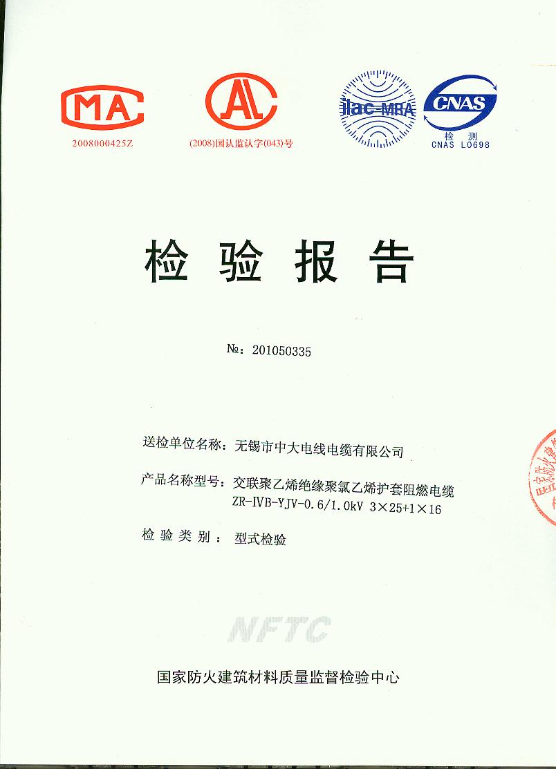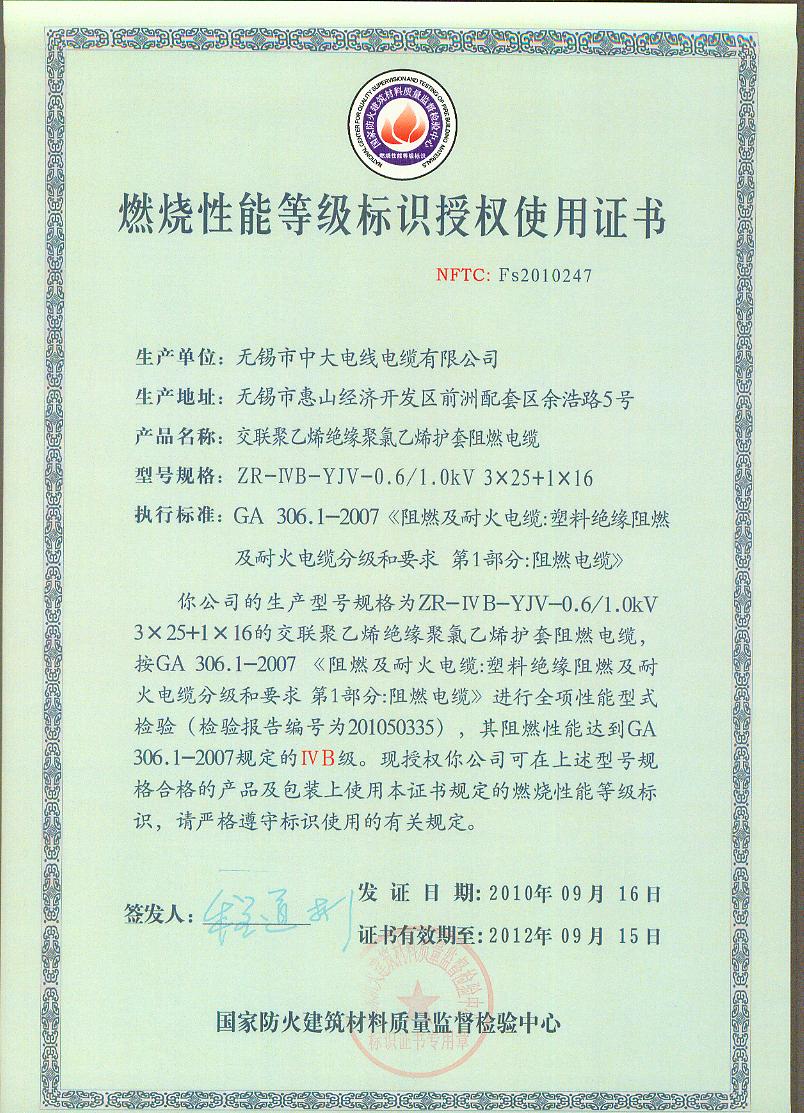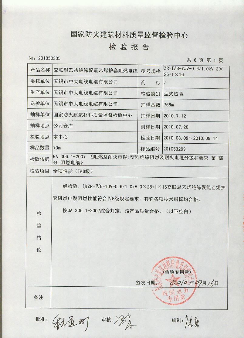经检验,该ZR-ⅣB-YJV-0.6/1.0kV 3×25+1×16交联聚乙烯绝缘聚氯乙烯护套阻燃电缆阻燃性能符合ⅣB级规定要求,其它各项技术指标均合格。 按GA 306.1-2007综合判定,该产品质量合格。 (以下空白)