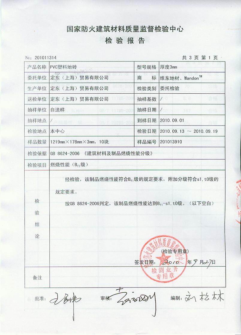 经检验,该制品燃烧性能符合B级的规定要求,附加分级符合s1,d0,t1级的规定要求。按GB 8624-2006判定,该制