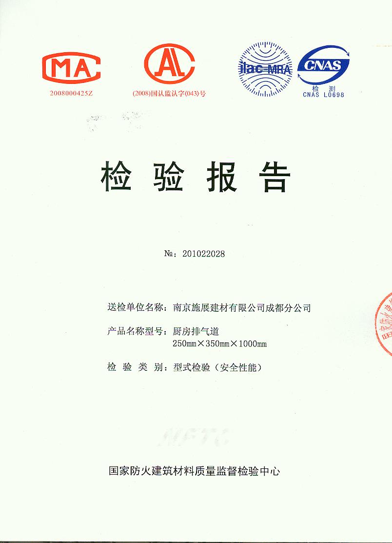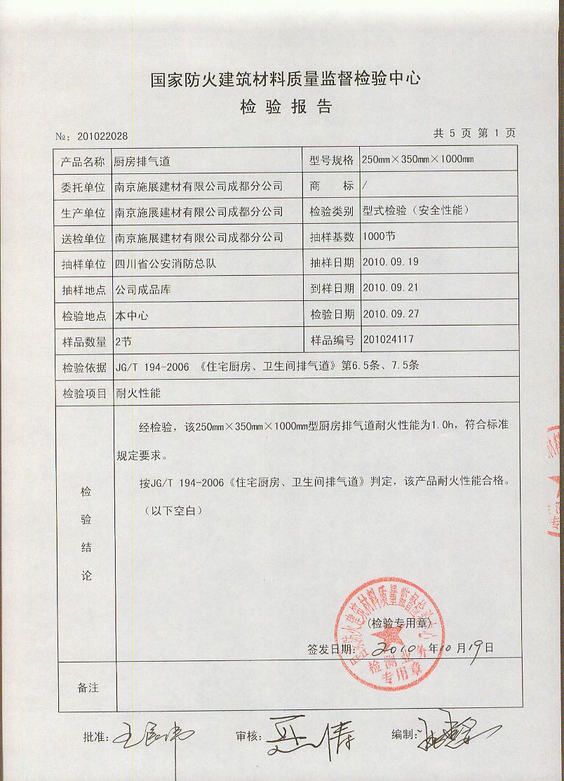 经检验,该250mm×350mm×1000mm型厨房排气道耐火性能为1.0h,符合标准规定要求。 按《住宅厨房、卫生间排气道》判定,该产品耐火性能合格。
