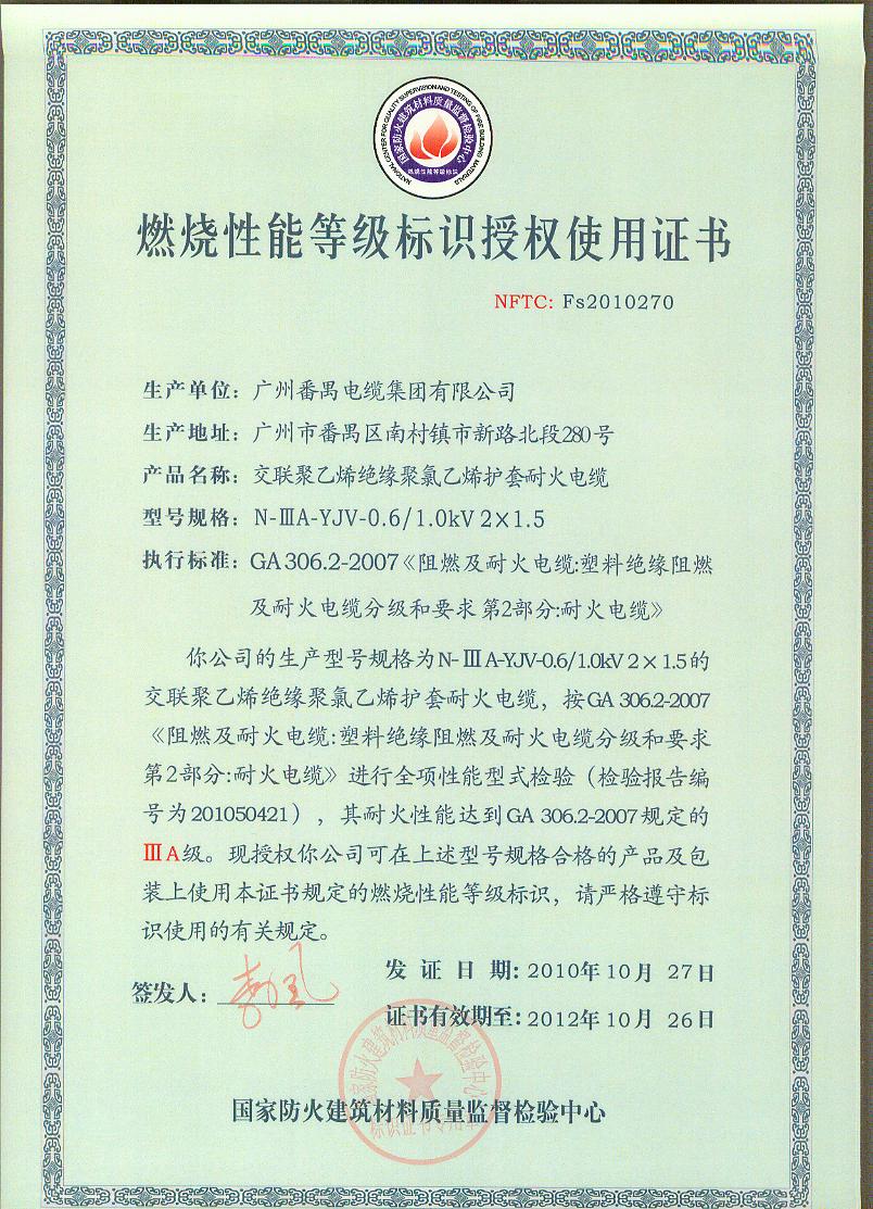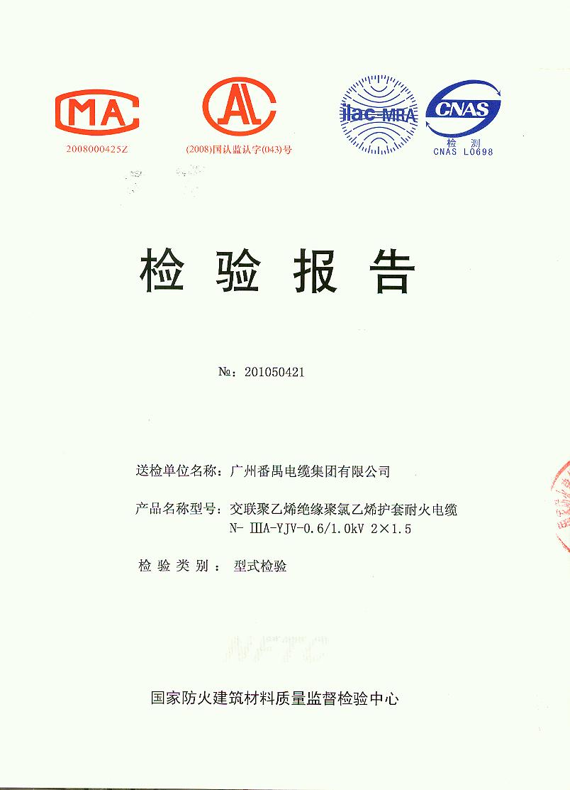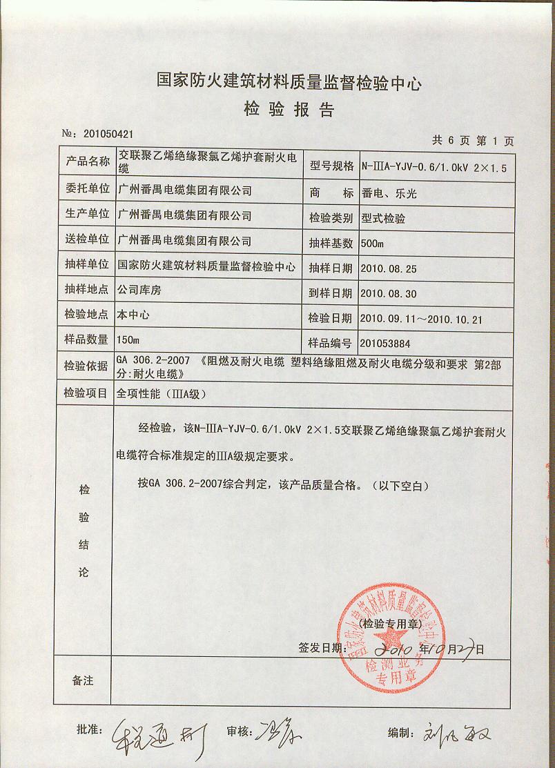 经检验,该N-ⅢA-YJV-0.6/1.0kV 2×1.5交联聚乙烯绝缘聚氯乙烯护套耐火电缆符合标准规定的耐火ⅢA级规定要求。 按GA 306.2-2007综合判定,该产品质量合格。(以下空白)