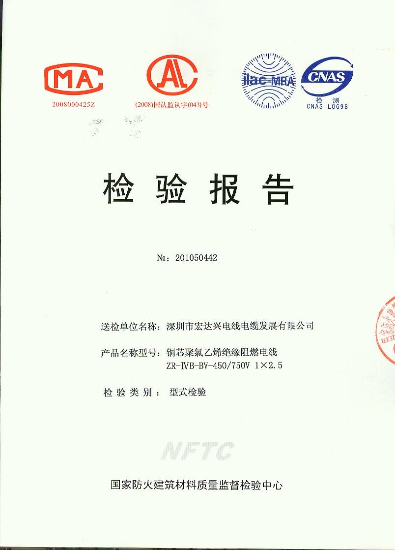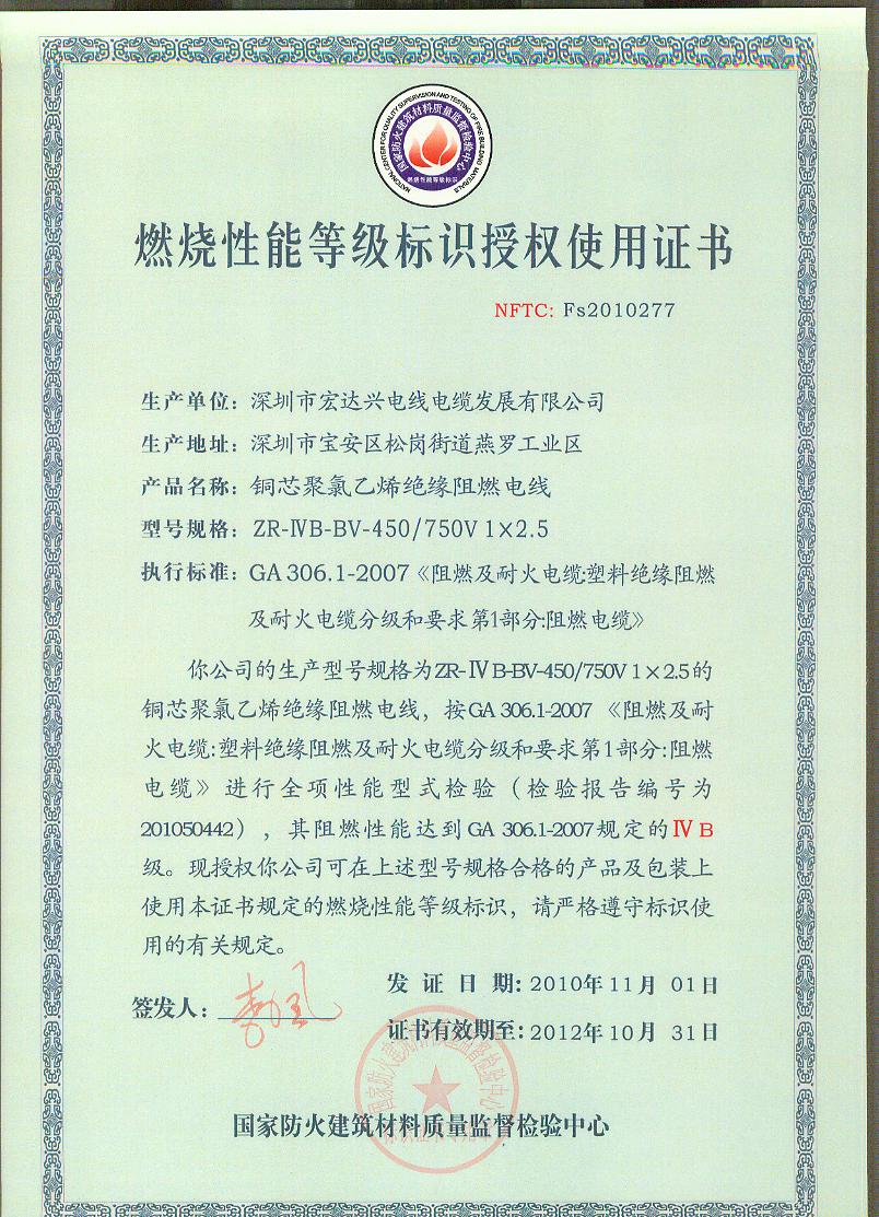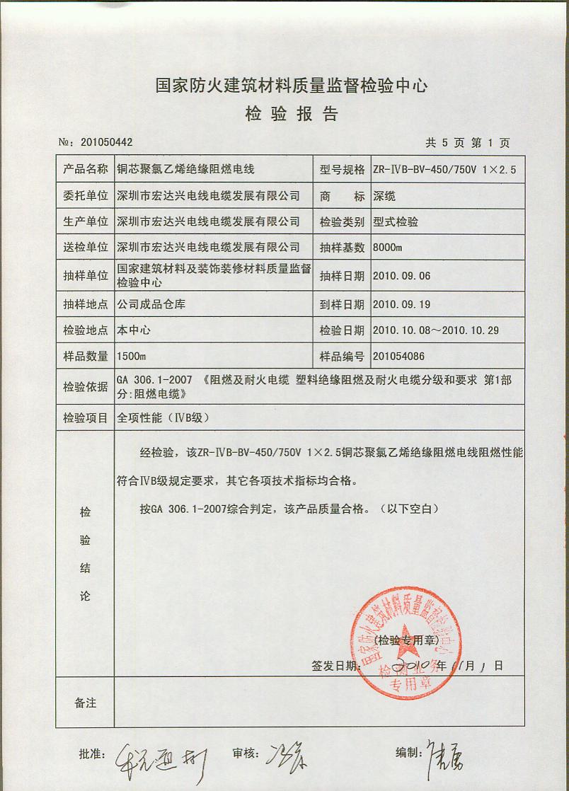 经检验,该ZR-ⅣB-BV-450/750V 1×2.5铜芯聚氯乙烯绝缘阻燃电线阻燃性能符合ⅣB级规定要求,其它各项技术指标均合格。 按GA 306.1-2007综合判定,该产品质量合格。 (以下空白)