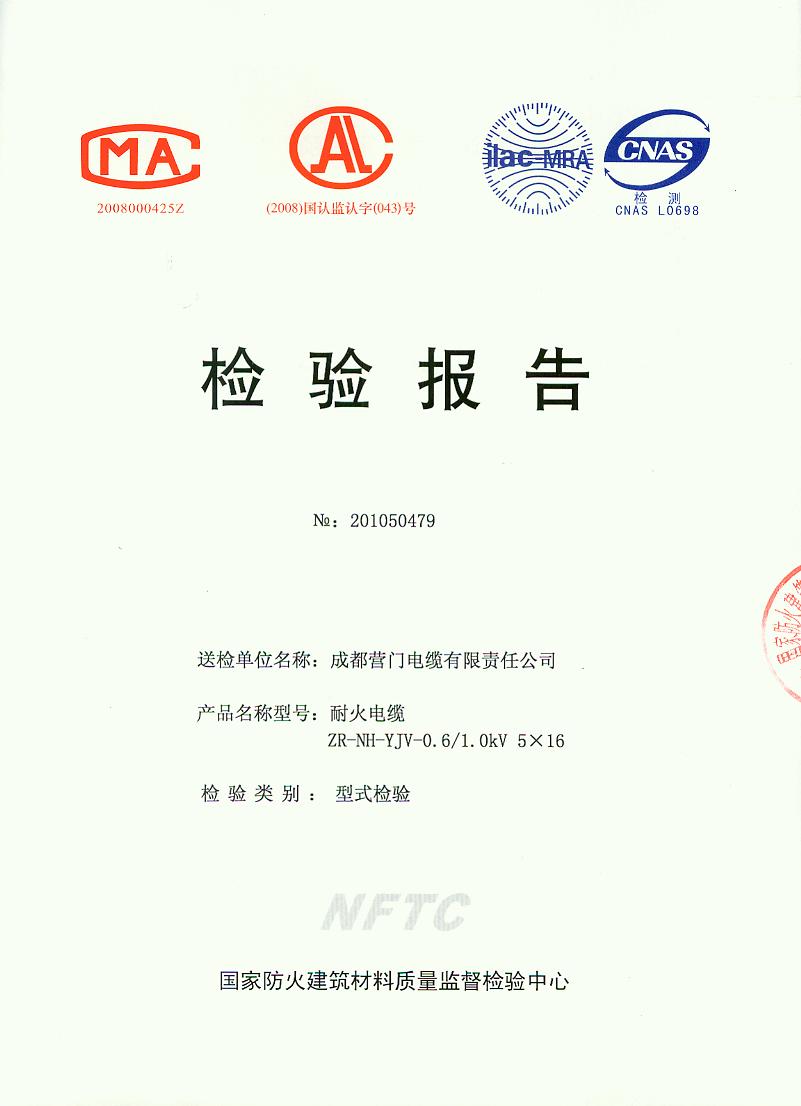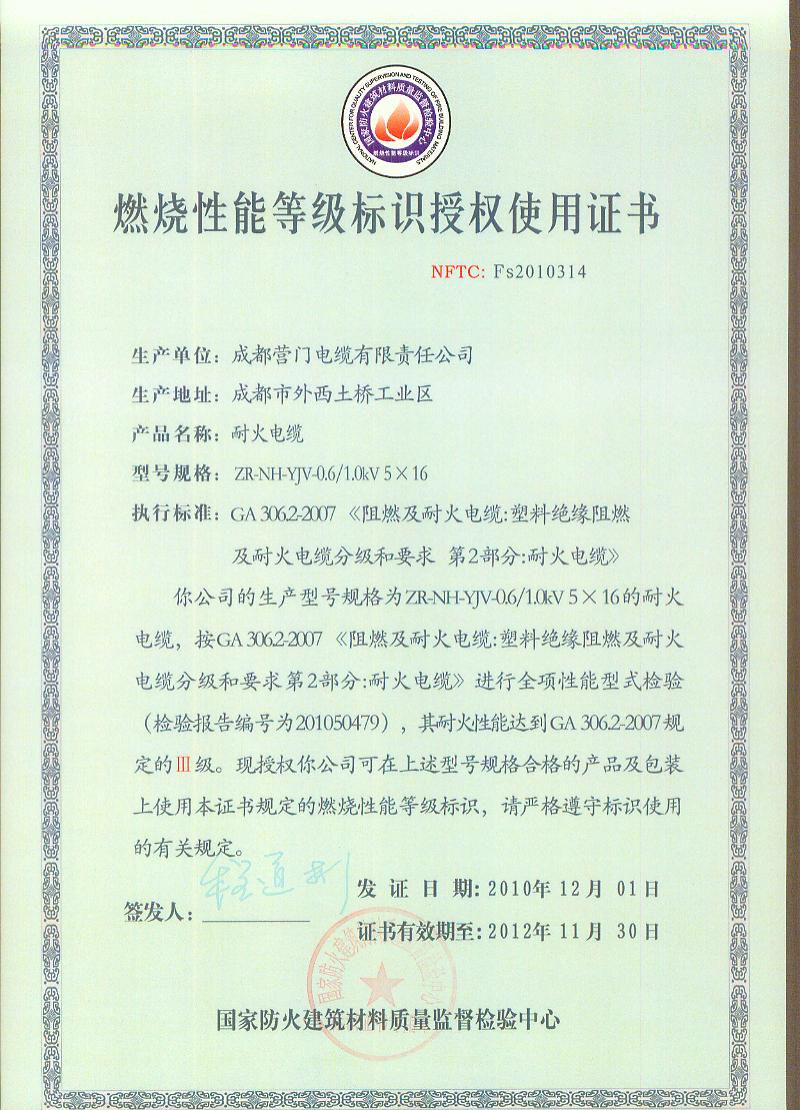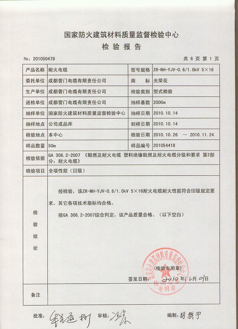 经检验,该ZR-NH-YJV-0.6/1.0kV 5×16阻燃耐火挤包绝缘电力电缆耐火性能符合Ⅲ级规定要求,其它各项技术指标均合格。按GA 306.2-2007综合判定,该产品质量合格。(以下空白)