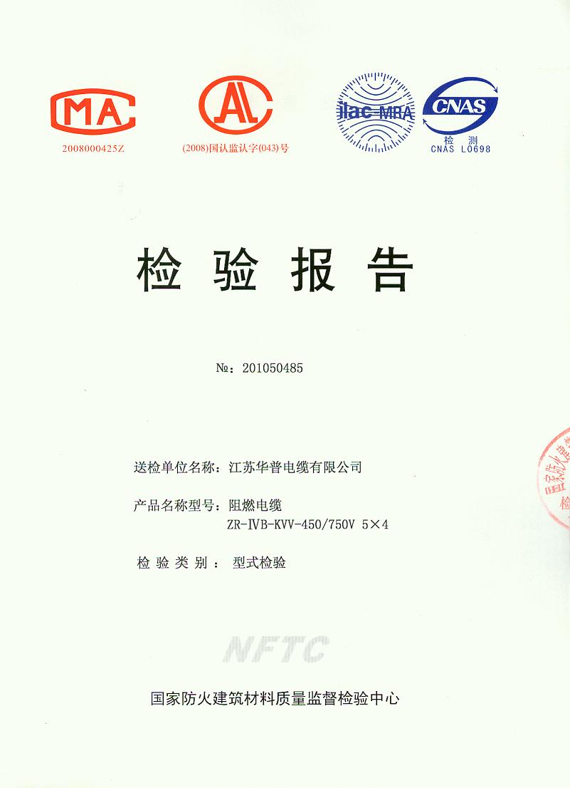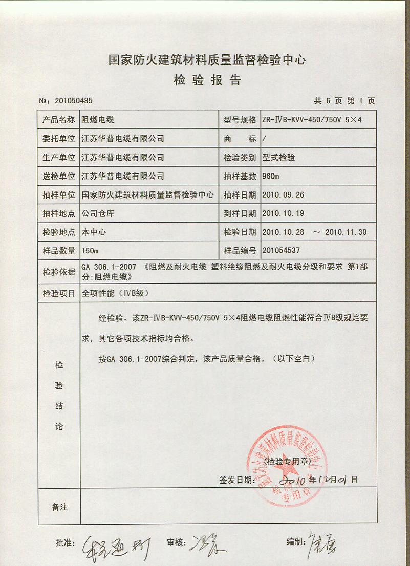 经检验,该ZR-ⅣB-KVV-450/750V 5×4阻燃电缆阻燃性能符合ⅣB级规定要求,其它各项技术指标均合格。按GA 306.1-2007综合判定,该产品质量合格。(以下空白)