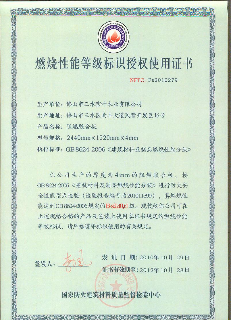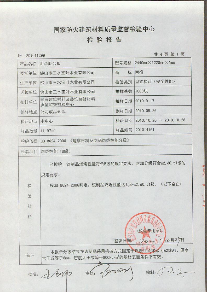经检验,该制品燃烧性能符合B级的规定要求,附加分级符合s2,d0,t1级的规定要求。 按GB 8624-2006判定,该制品燃烧性能达到B-s2,d0,t1级。(以下空白)