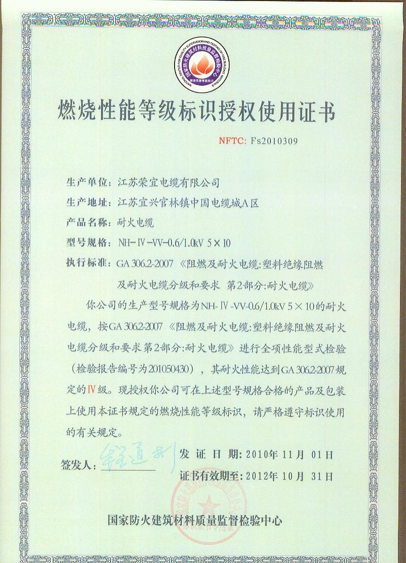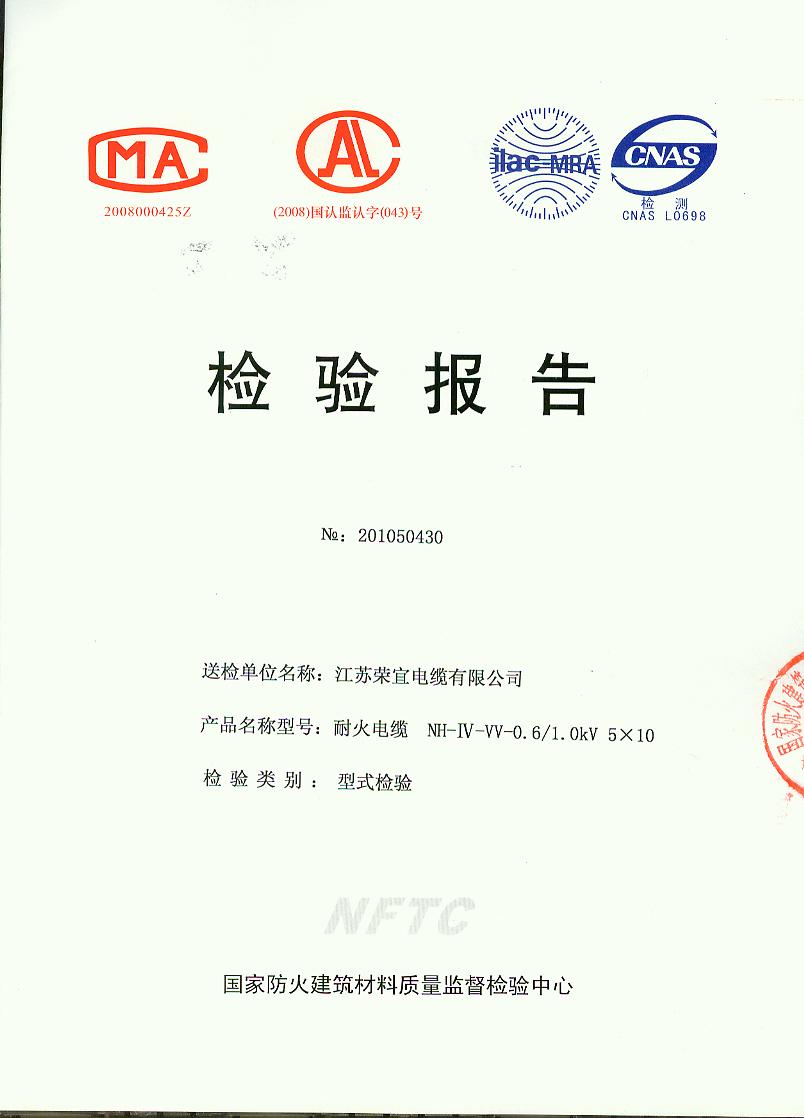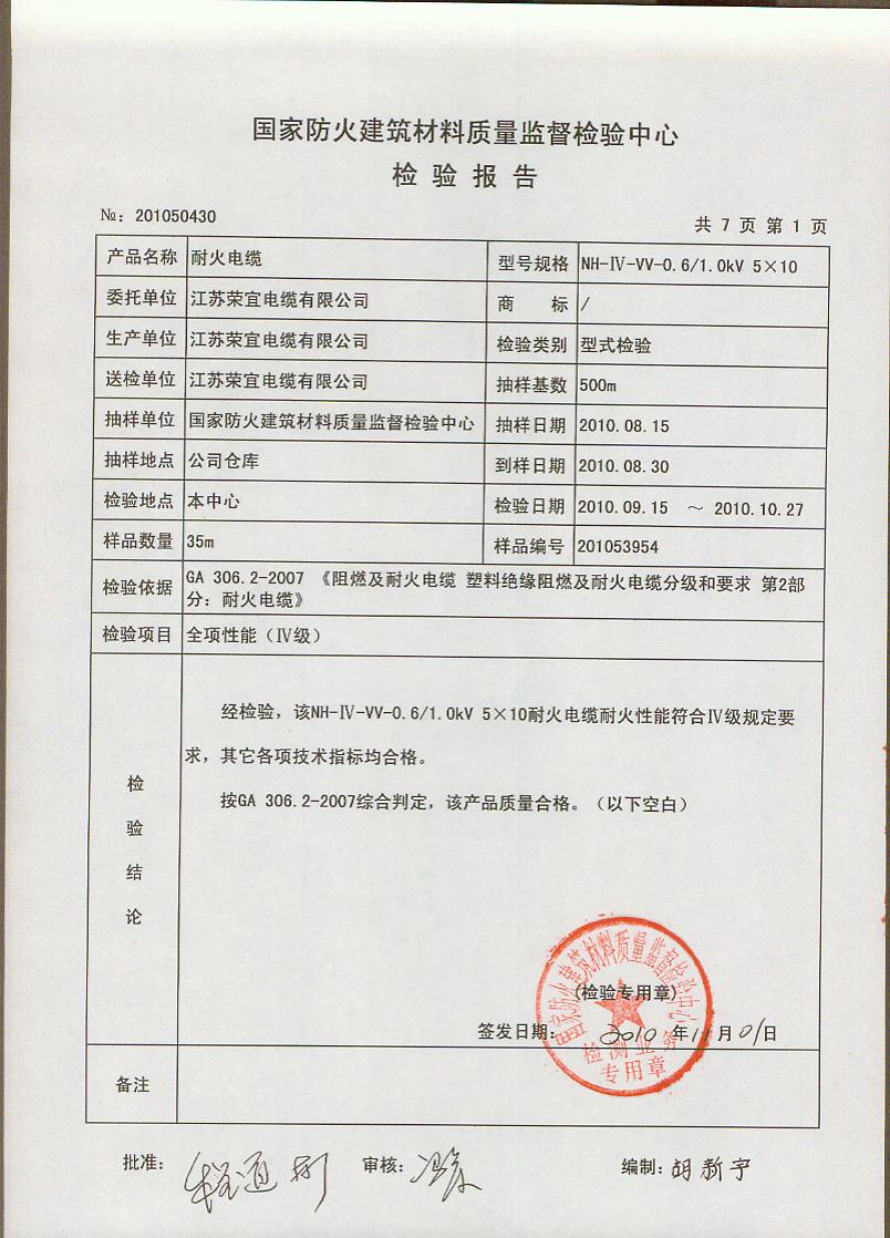 经检验,该NH-Ⅳ-VV-0.6/1.0kV 5×10耐火电缆耐火性能符合Ⅳ级规定要求,其它各项技术指标均合格。按GA 306.2-2007综合判定,该产品质量合格。(以下空白)