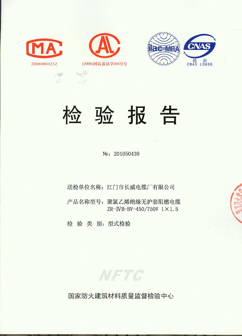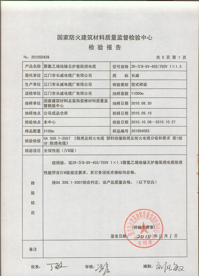 经检验,该ZR-ⅣB-BV-450/750V 1×1.5聚氯乙烯绝缘无护套阻燃电缆阻燃性能符合ⅣB级规定要求,其它各项技术指标均合格。按GA 306.1-2007综合判定,该产品质量合格。(以下空白)