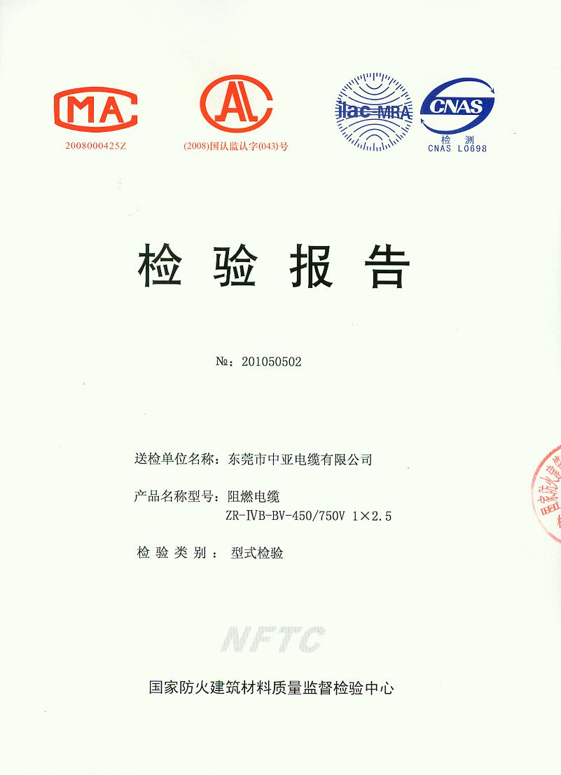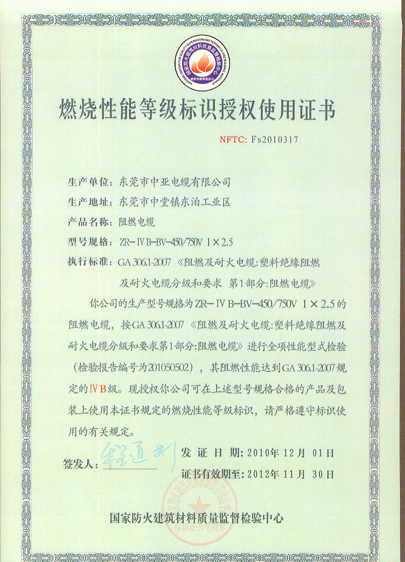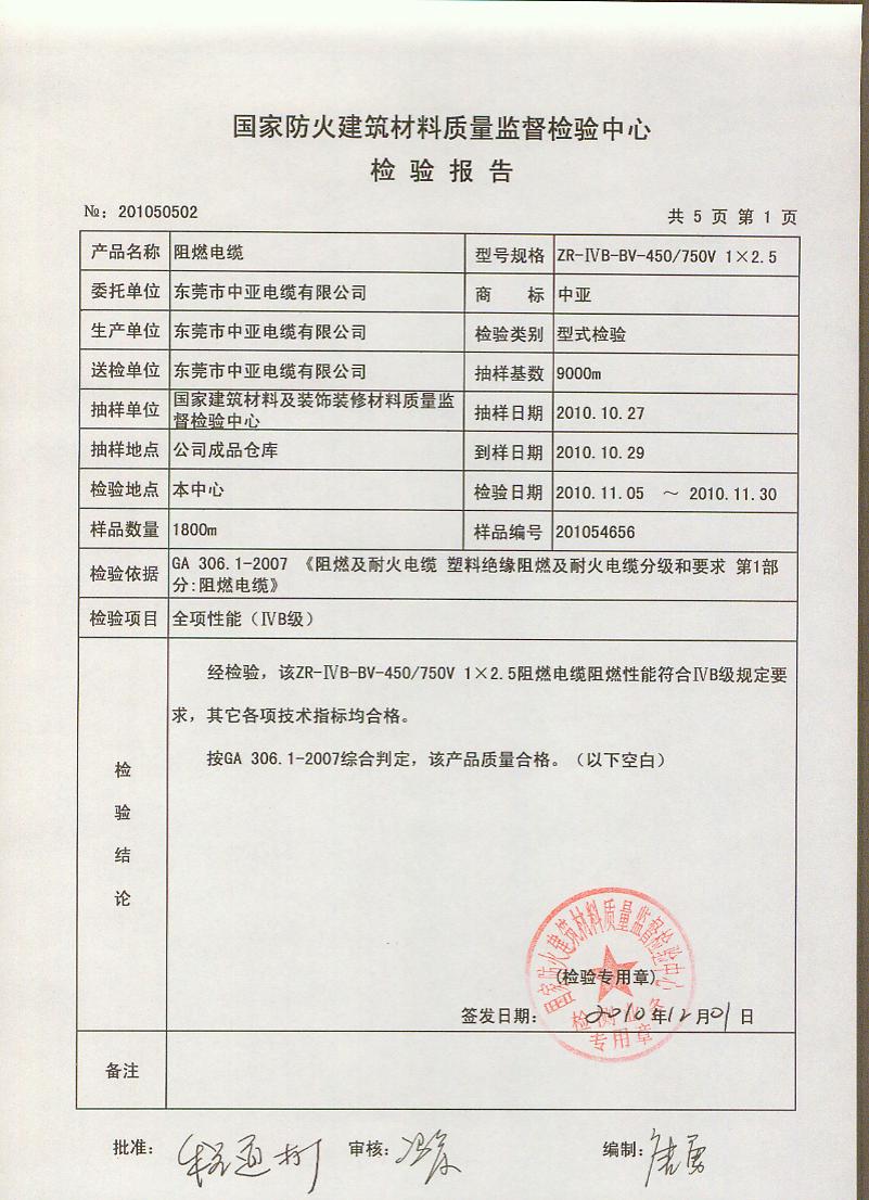经检验,该BV-450/750V 1×2.5阻燃电缆阻燃性能符合ⅣB级规定要 求,其它各项技术指标均合格。 按GA 306.1-2007综合判定,该产品质量合格。 (以下空白)