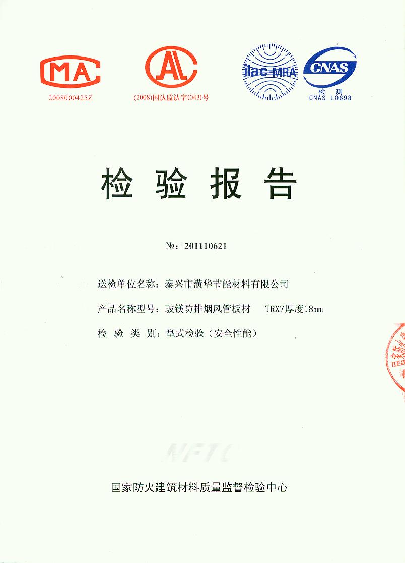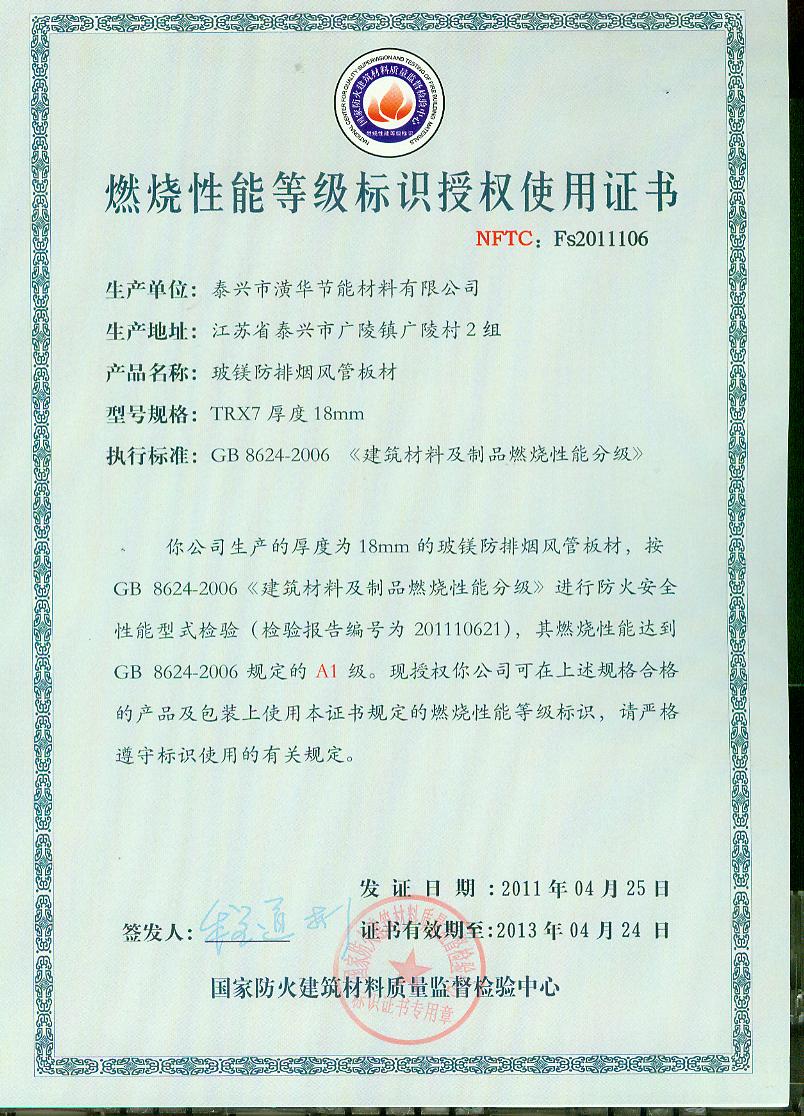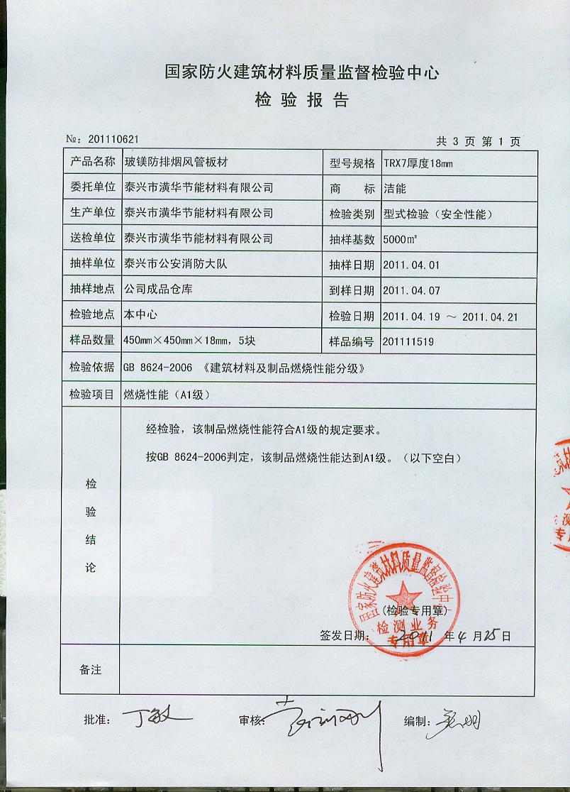 经检验,该制品燃烧性能符合A1级的规定要求。按GB 8624-2006判定,该制品燃烧性能达到A1级。(以下空白)
