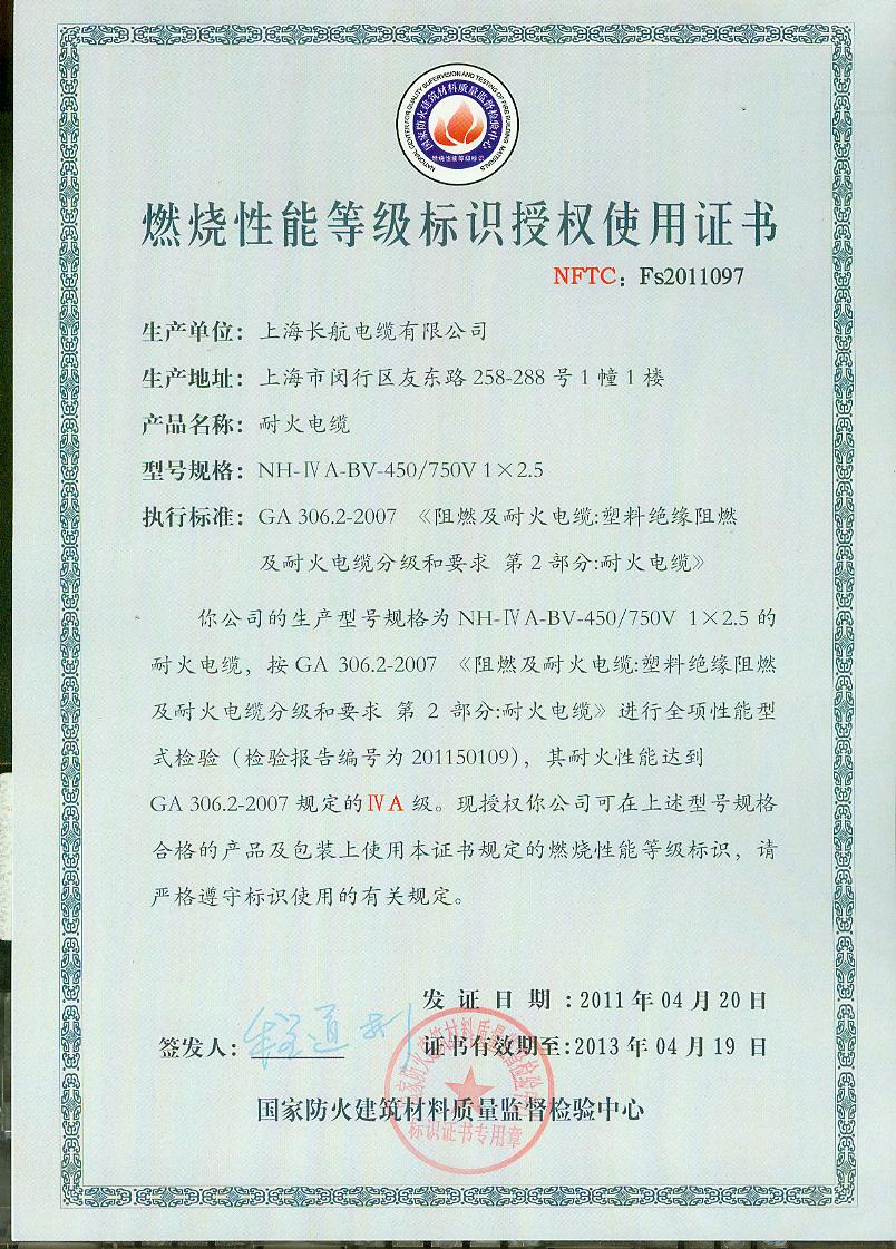 经检验,该NH-ⅣA-BV-450/750V 1×2.5耐火电缆耐火性能符合ⅣA级规定要求,其它各项技术指标均合格。按GA 306.2-2007综合判定,该产品质量合格。(以下空白)