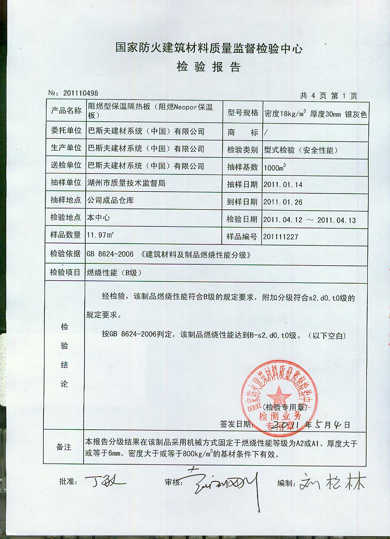 经检验,该制品燃烧性能符合B级的规定要求,附加分级符合s1,d0,t1级的规定要求。按GB 8624-2006判定,该制