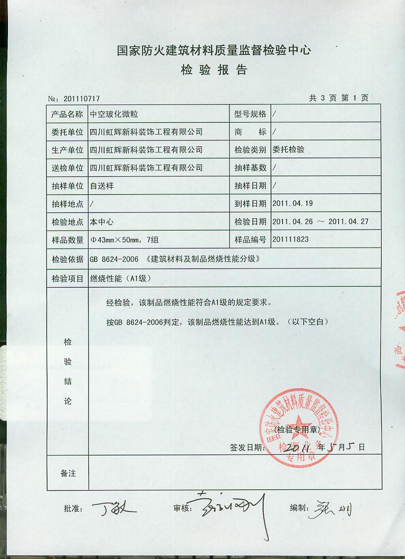 经检验,该制品燃烧性能符合A1级的规定要求。按GB 8624-2006判定,该制品燃烧性能达到A1级。(以下空白)