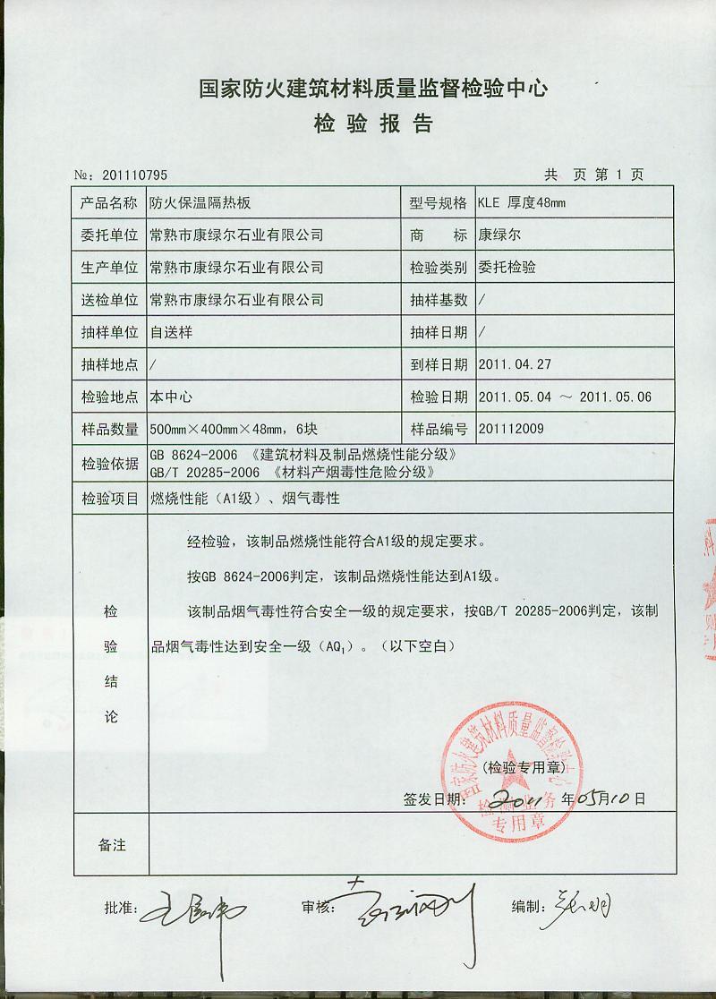 经检验,该制品燃烧性能符合A1级的规定要求。按GB 8624-2006判定,该制品燃烧性能达到A1级。(以下空白)