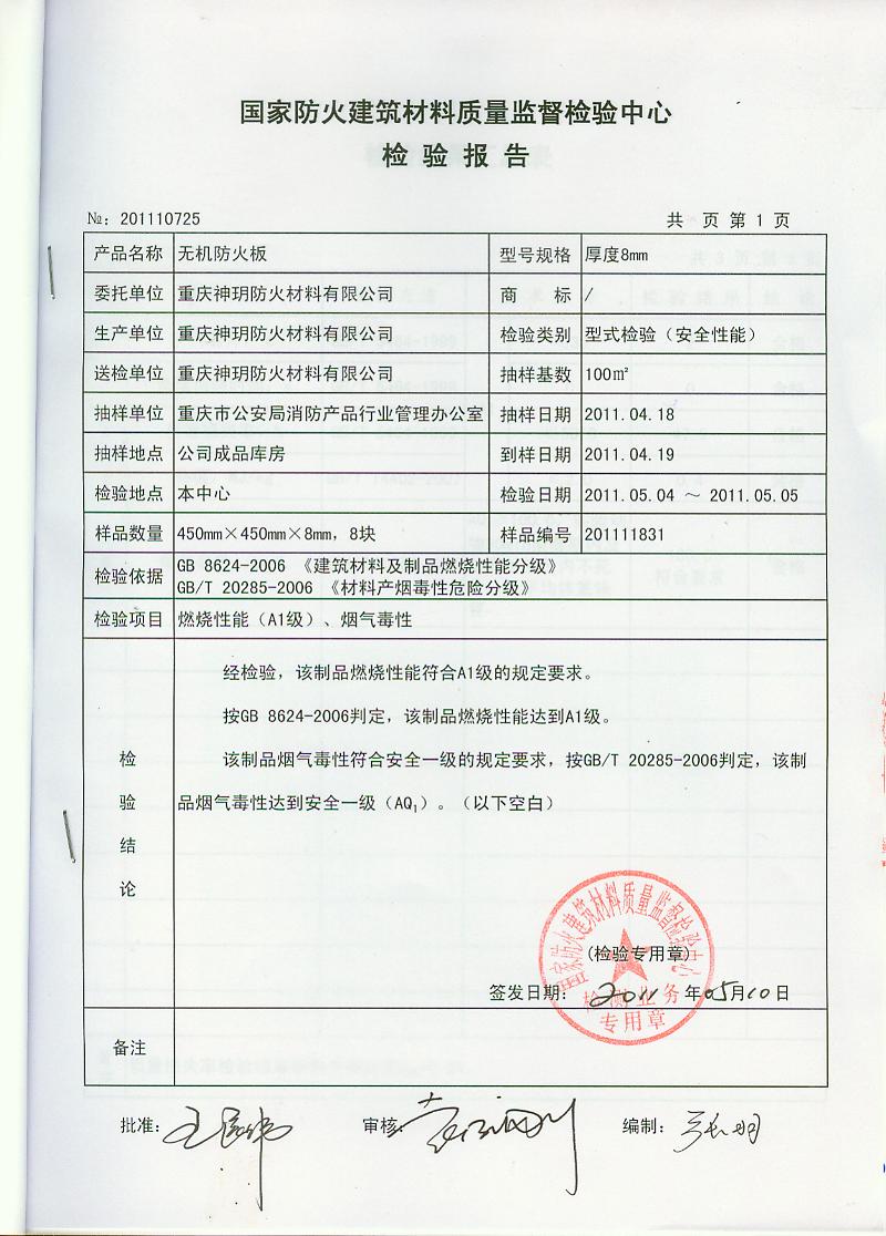 经检验,该制品燃烧性能符合A1级的规定要求。按GB 8624-2006判定,该制品燃烧性能达到A1级。(以下空白)