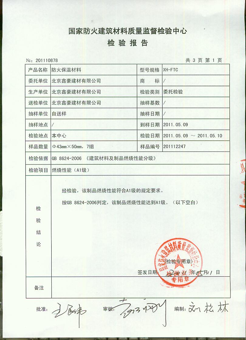 经检验,该制品燃烧性能符合A1级的规定要求。按GB 8624-2006判定,该制品燃烧性能达到A1级。(以下空白)