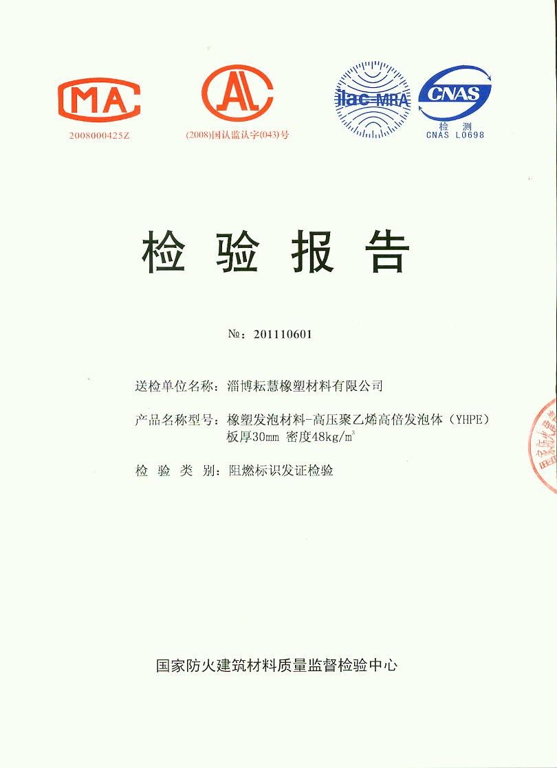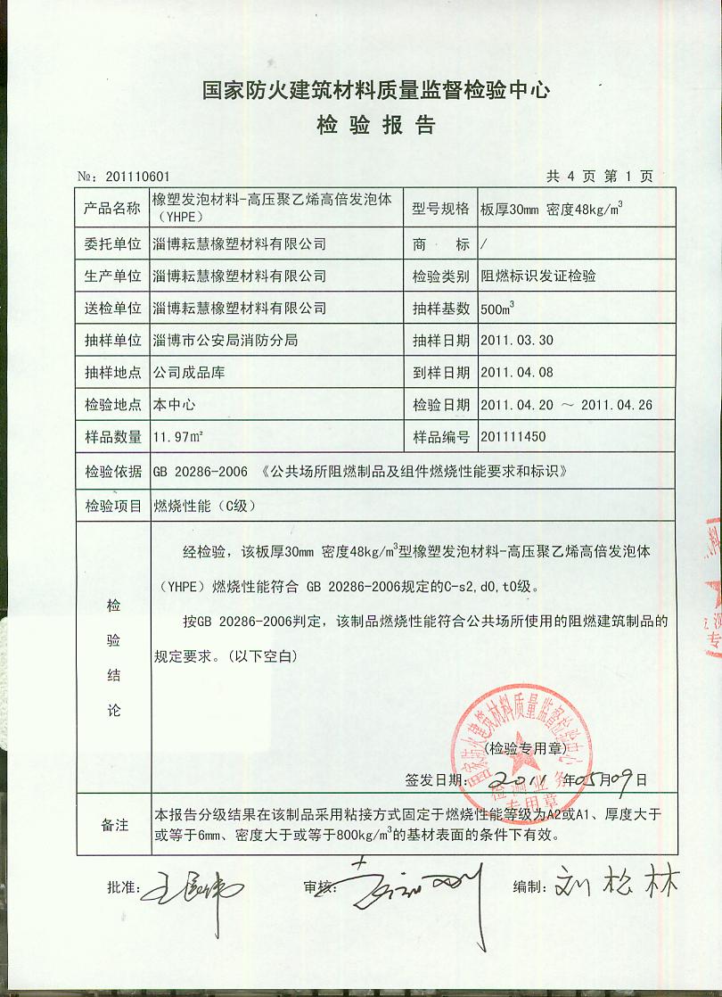 经检验,该材料燃烧性能符合C级的规定要求,按GB 8624-2006判定,该材燃烧性能达到C-s,d,t级。