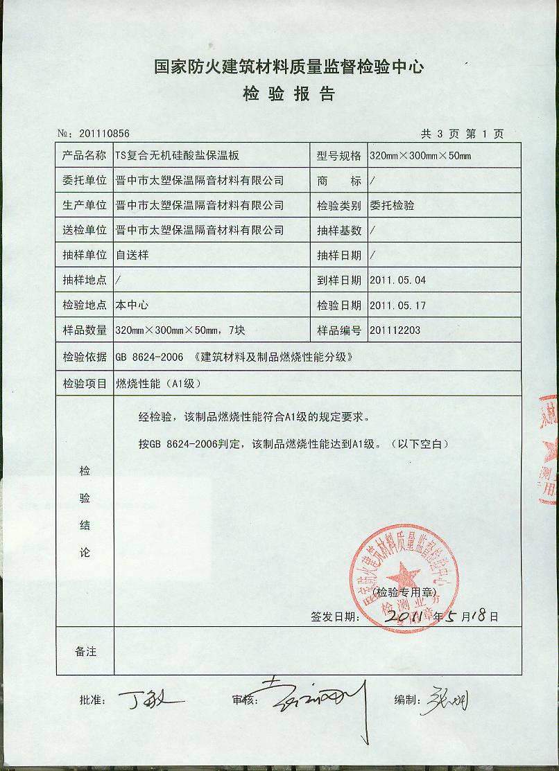 经检验,该制品燃烧性能符合A1级的规定要求。按GB 8624-2006判定,该制品燃烧性能达到A1级。(以下空白)