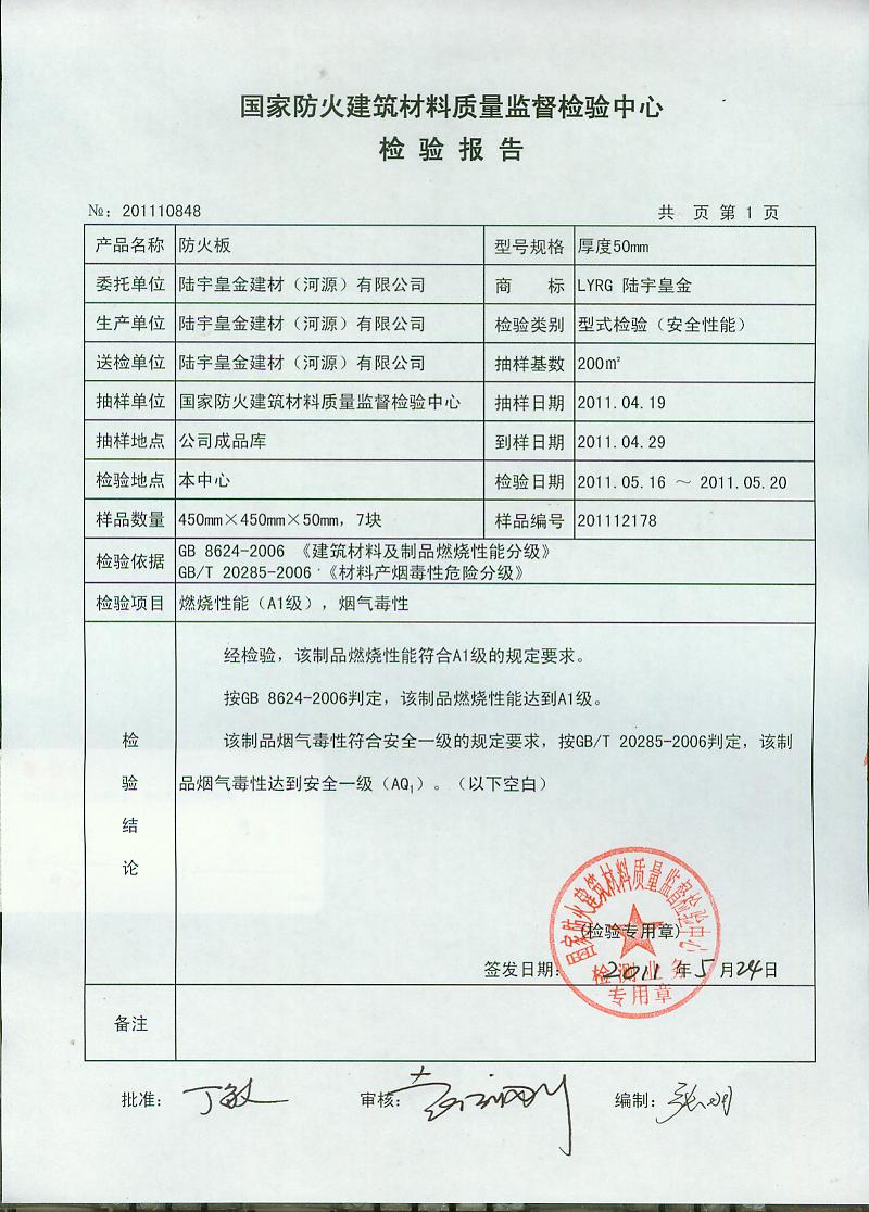 经检验,该制品燃烧性能符合A1级的规定要求。按GB 8624-2006判定,该制品燃烧性能达到A1级。(以下空白)