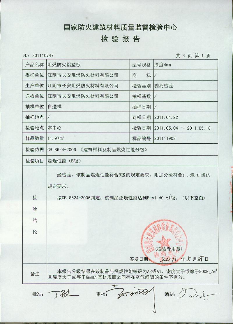 经检验,该制品燃烧性能符合B级的规定要求,附加分级符合s1,d0,t1级的规定要求。 按GB 8624-2006判定,该制品燃烧性能达到B-s1,d0,t1级。(以下空白)