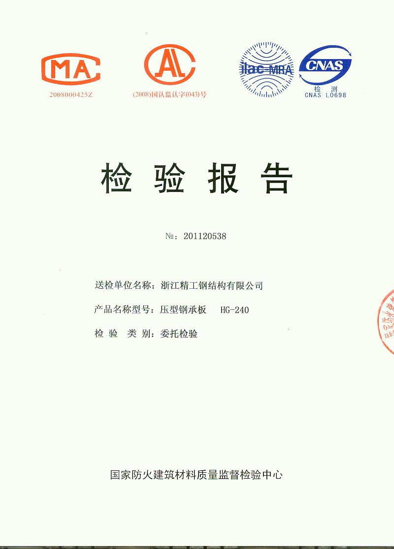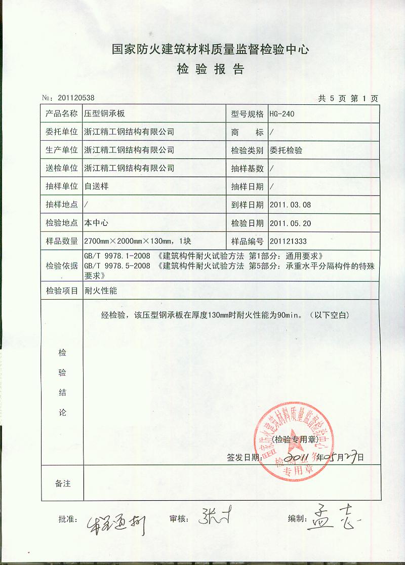 经检验,该压型钢承板在厚度130mm时耐火性能为90min。(以下空白)