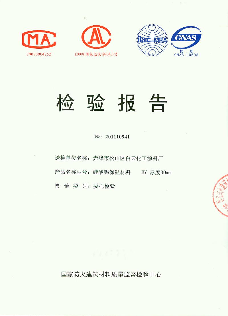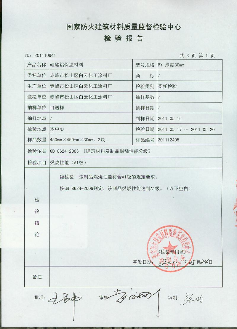 经检验,该制品燃烧性能符合A1级的规定要求。按GB 8624-2006判定,该制品燃烧性能达到A1级。(以下空白)