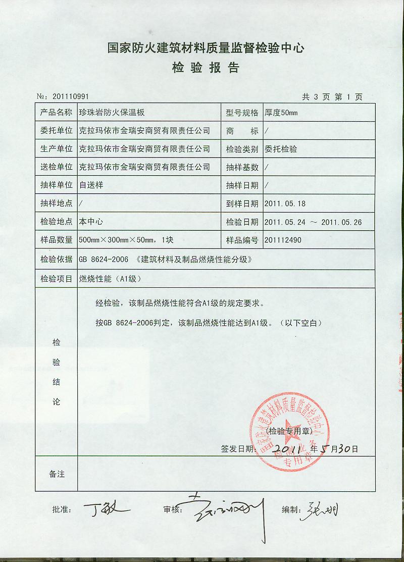 经检验,该制品燃烧性能符合A1级的规定要求。按GB 8624-2006判定,该制品燃烧性能达到A1级。(以下空白)