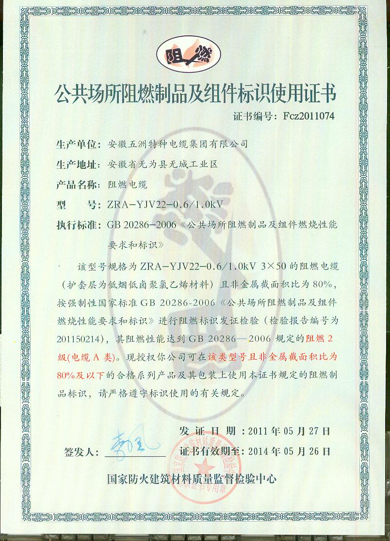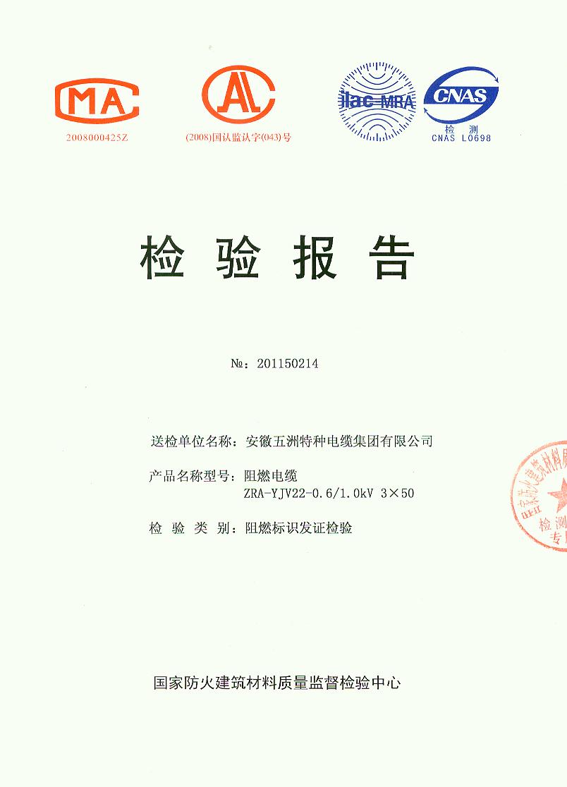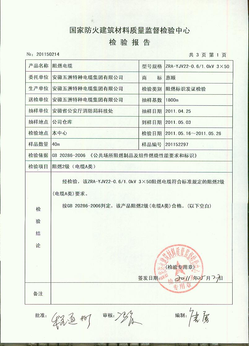 经检验,该ZRA-YJV22-0.6/1.0kV 3×50阻燃电缆符合标准规定的阻燃2级(电缆B类)要求。 按GB 20286-2006判定,该产品阻燃2级(电缆B类)合格。(以下空白)