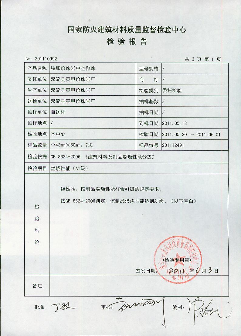 经检验,该制品燃烧性能符合A1级的规定要求。按GB 8624-2006判定,该制品燃烧性能达到A1级。(以下空白)