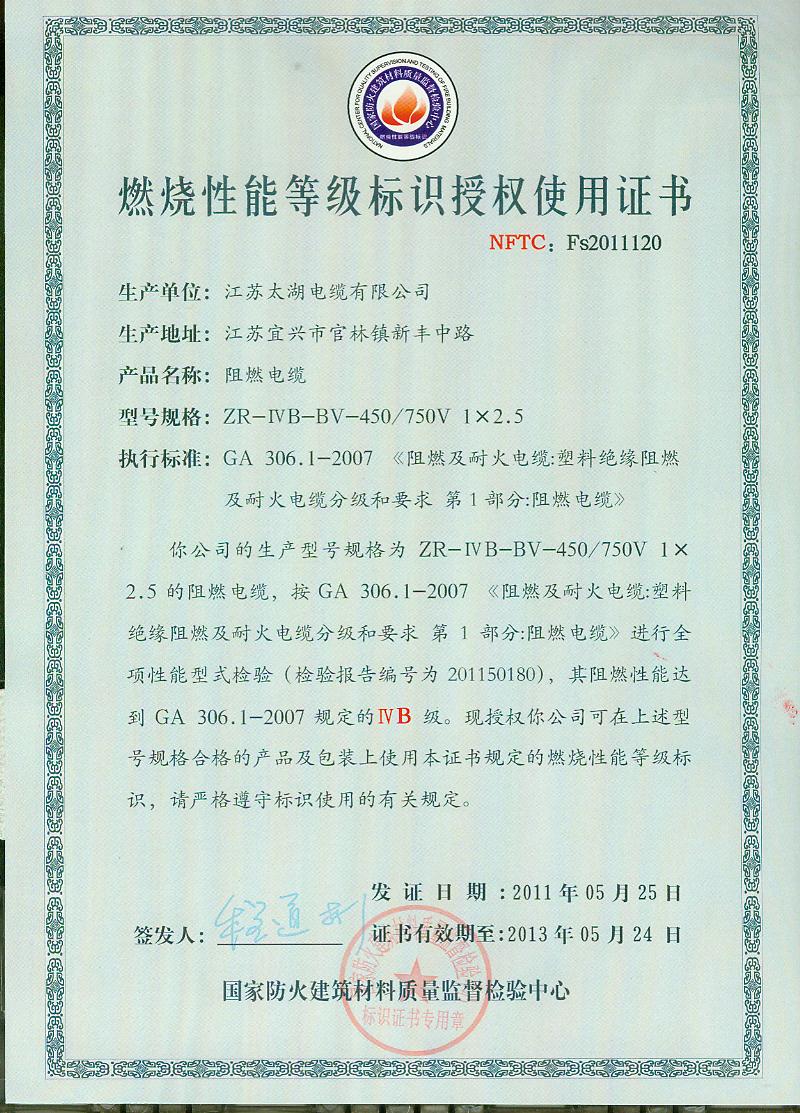 经检验,该ZR-ⅣB-BV-450/750V 1×2.5阻燃电缆阻燃性能符合ⅣB级规定要求,其它各项技术指标均合格。按GA 306.1-2007综合判定,该产品质量合格。(以下空白)