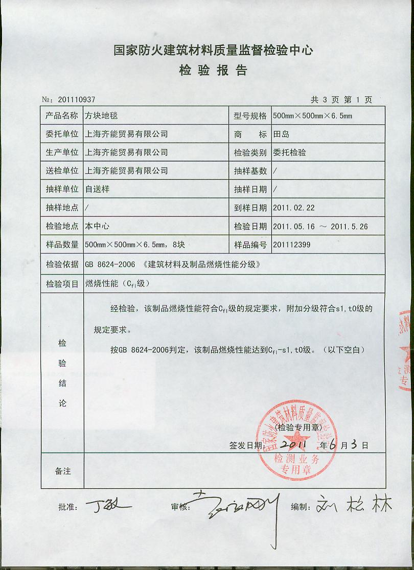 经检验,该材料燃烧性能符合C级的规定要求,按GB 8624-2006判定,该材燃烧性能达到C-s,d,t级。