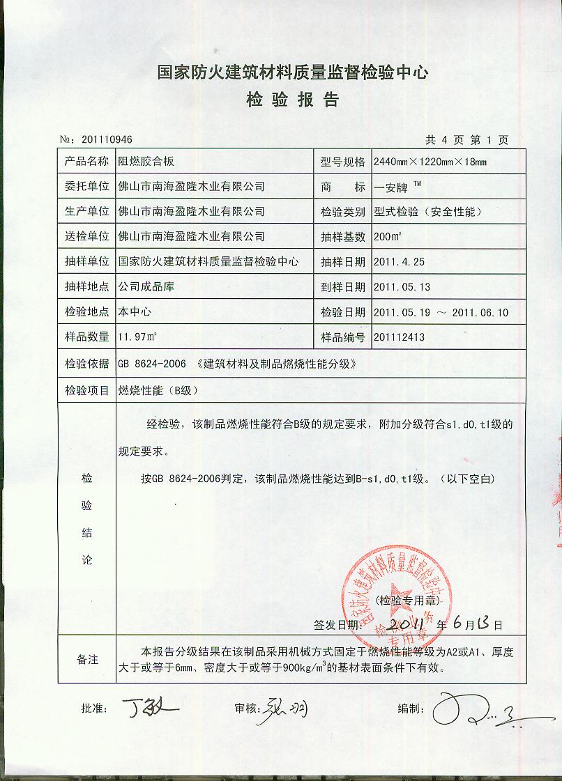 经检验,该制品燃烧性能符合B级的规定要求,附加分级符合s1,d0,t1级的规定要求。按GB 8624-2006判定,该制品燃烧性能达到B-s1,d0,t1级。(以下空白)