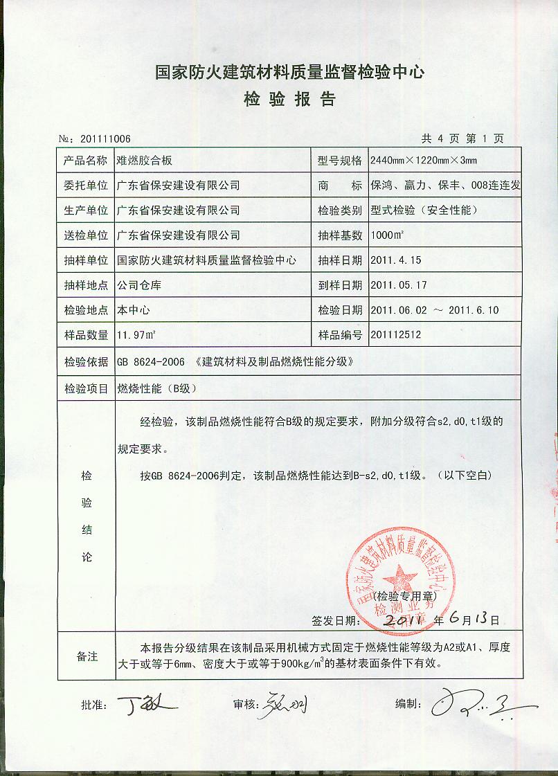 经检验,该制品燃烧性能符合B级的规定要求,附加分级符合s2,d0,t1级的规定要求。 按GB 8624-2006判定,该制品燃烧性能达到B-s2,d0,t1级。(以下空白)